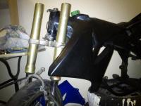 16. alors voilà c bon ! la fourche de la xr6 passe mais avec quelque modif que j'ai commencer à faire ! la fourche de la xr6 placer sa gener donc on coupe ! et voilà le tout coupé ! reste plus qu'a tout bien poncer et a peindre ! et sinon petite question ? ppour le guidon je fais quoi ? je laisse avec les poignée style routiere ou je met un guidon style cross ?