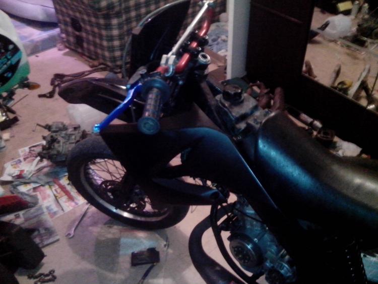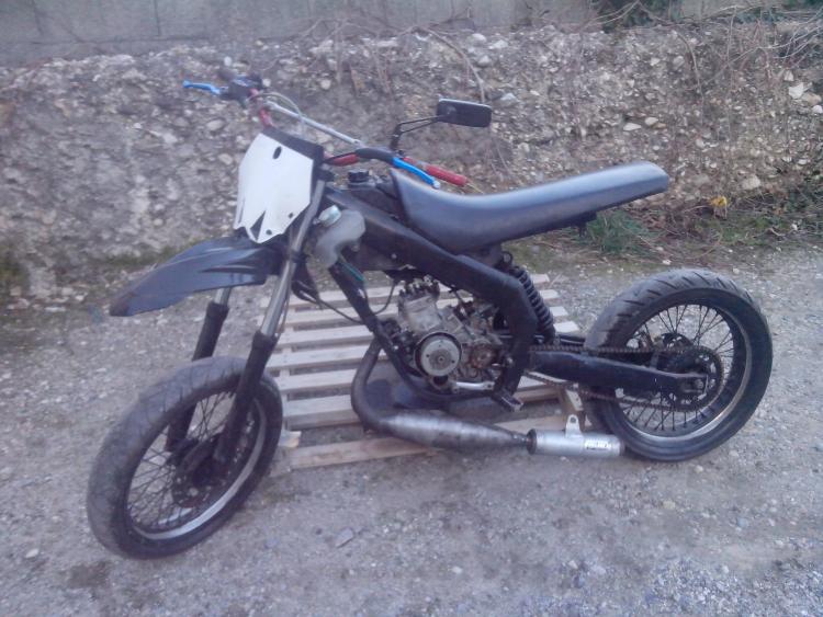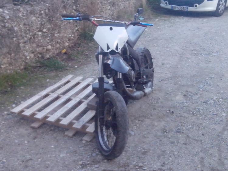 8. bon voilà , J'ai les nouvelle photo de la moto qui a ete remis en route il y a peu ! bon j'ai changer les segment du kit et refai la peinture de la moto ! ==> ==> ==> Quel plaque phare irei le mieux a votre avis ? voilà coté estetique ! en attendant le kit deco Monster Energy que compte mettre dessus ! Mintenant coté Moteur , j'ai mis un nouveau carburateur 17.5 Do NEUF qui trainer chez moi (en attendant d'acheter le 21 !) et j'ai mis une boîte à air de karting Conti CRX ! Transmi en 15/48 ! Photo :::: ==> ==>