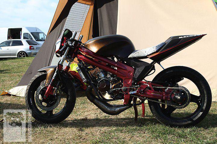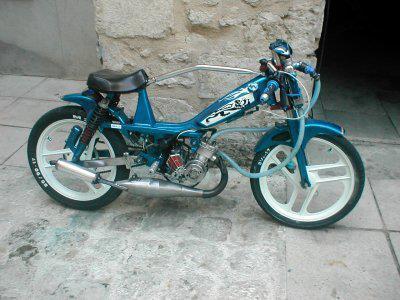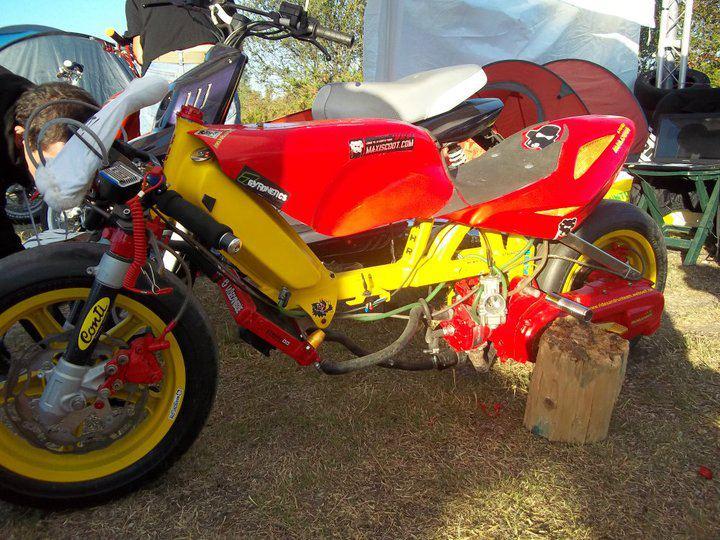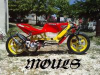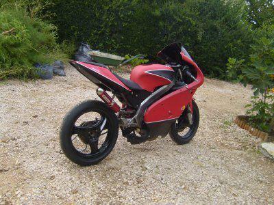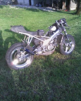 bjr je vous présente mon proget de proto de run pour la saison 2013 qui et actuelement en cour de remontage final base : suzuki rg 80 gama modif chassi : _cadre suzuki rg modifier _bras derbi tubu ralonger de 9CM puit souder au cadre (empatement ralonger de 13Cm par raport a empatement origine du rg ) _fourche rigide maison poli _jante sm derbi poli et peinte _guidon bracelet de mob _amortisseur de direction toby prevu pour yamaha r1 _mc de frein avant nissin bocal séparer et arr nissin de gros cube poli tt les 2 _étrier avant Rieju matrix poli et arr ajp mi poli mi peind _disque derbi poli _leche roue arr suzuki avec decoupe _leche roue avant de tzr modifier _monocoque (en cour) base arrière et faux réservoir de gpr modifier , mouler , decoupe ...... _cale pied de tzr poli _ tirage rapide poli de kx 125 _poignet progrip _coupe circuit type jet configuration moteur : _carter derbi E2 prépa _passage bac gros volume _ vilebrequin mvt sc course 44.8 _ haut moteur bidalot factory 80 retoucher _ bac vhm 125 yz _pipe 80 cr _ carburateur keihin 36 air striker ou 30 koso ( test prevu prochainement ) _ allumage mvt dd _embrayage polini _ressort embrayage mhr sur cale _ pot bidalot factory 80 _ boîte origine _chaine conti rouge _ boîte à air maison _ câble embrayage kx125 _radiateur suzuki rg80 bocoup de pièce poli ( carter embrayage , carter moteur mi poli mi peind , pipe ,étrier , mc selecteur , pedale de frein , platine repose pied , cale pied , fourche , jante ....................) voilà je pence avoir fait le tour ( j'ai du oublier des bricol ^^ ) rdv sur les meeting de 2013 ;)