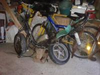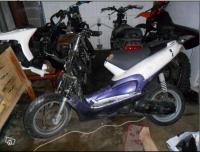 J'ai été cherche le scoot set aprem , j'ai pas mal miséré a le ramené en le tractent avec un autre scoot , après avoir fait a peu-pré 10km la rehausse se casse donc obliger d'attendre que un pote parte me cherche des outil pour bricoler sa pour pouvoir rentre cher moi . Après environ 1h30 je suis enfin rentre cher moi . donc je commence a le démonter et la les bonne surprisse arrive , alors kit 50 top noir , culasse Stage6 , variateur malossi , carburateur 17.5mm , et l'embrayage pas pu voir car j'ai pas pu le démonte du moteur . voilà l'état du scoot sinon les point négatif faisceaux manger par un chien , manque quasiment tous les écrou et pas mal de boulot pour le remétrer en état correct . -