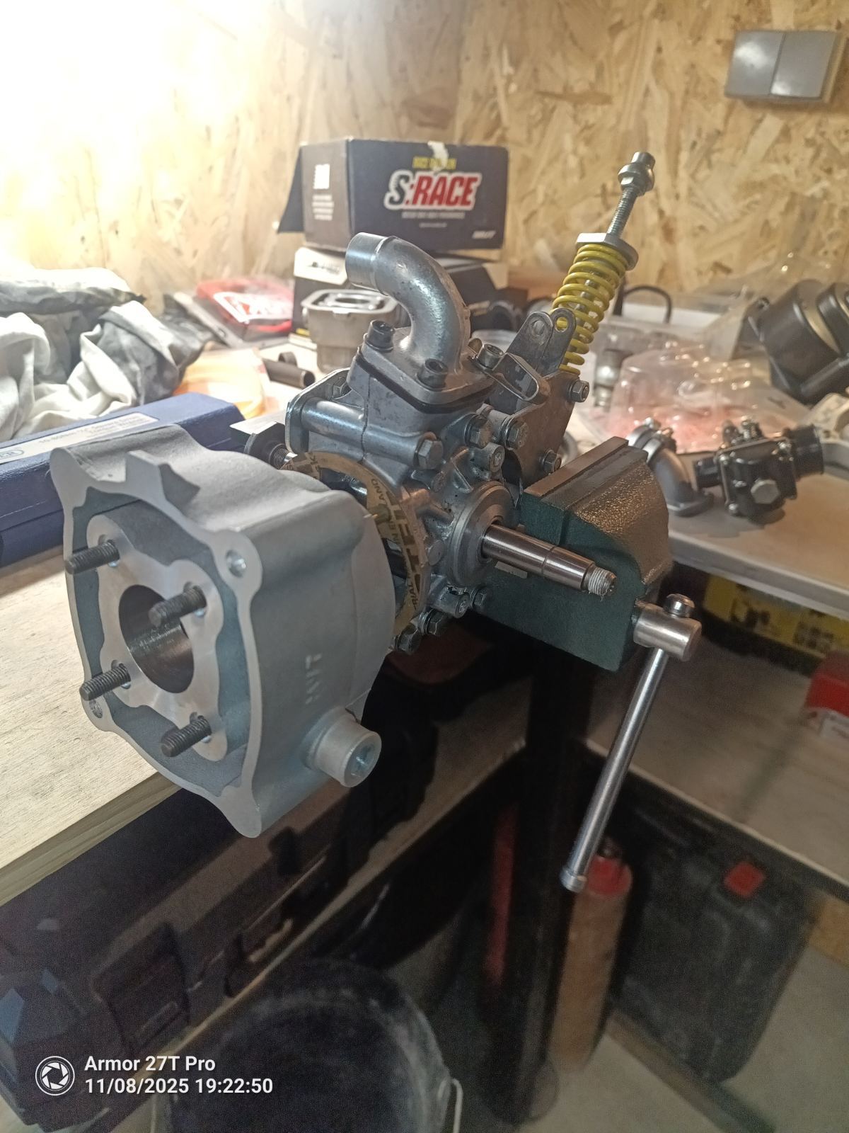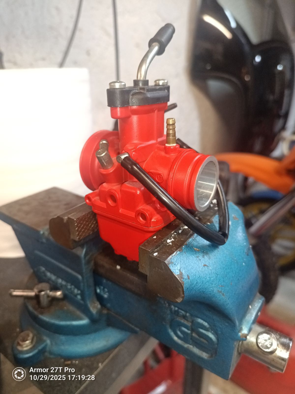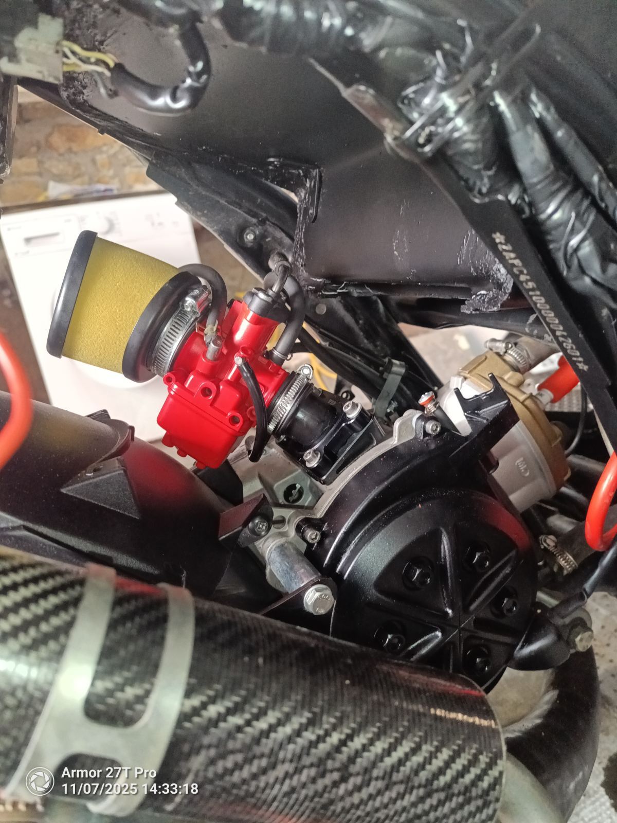 Avant le montage j'ai comme à mon habitude vérifié le jeu à la coupe, ébavuré toutes les lumières etc en plus on est sur un cylindre alu au nickasil donc je considère que le rodage ne sera qu'une formalité 🤣 Mais évidemment je ne vais pas y taper trop dedans pendant un petit plein, j'ai aussi mis un peu plus d'huile 2,5% au lieu de 2%.. manière d'avoir bonne conscience quoi Alors j'ai des news ! Les lumières et le démarreur fonctionnent, j'avais supprimé le réservoir d'huile et débranché le capteur de niveau du réservoir d'huile... Mauvaise idée il sert aussi à faire une continuité du 12v ! Capteur rebranché, flotteur scotché en position haute pour éviter le défaut d'huile: problémo résoluto Après avoir fait un petit essai je reste persuadé que la batterie ne charge pas. Faudra que je surveille la tension de la batterie on verra bien. J'espère ne pas avoir un allumage à changer car la tension mesurée en sortie allumage était pas top: 11,4 volt En attendant j'ai tout remonté ça ne m'empêchera pas de rouler un peu avec pour commencer à régler le carburateur Je voulais faire un essai avec un gicleur plus gros mais impossible de retrouver mes gros gicleurs, j'ai retrouvé que mes petits gicleurs pour les petites configuration en 6mm, j'ai retrouvé tous mes gicleurs PHBG et Keihn mais évidemment la seule boîte qui manque... Faut dire que ces gros gicleurs ça fait 10 ans qu'ils n'ont pas servi Gicleur actuel (d'origine du carburateur): 134, ça mériterait sûrement d'essayer un peu plus gros donc j'ai commandé jusqu'à 150, ça arrive lundi. Vis de richesse dévissée de seulement 1 tour 1/4, visiblement ça suffit J'ai remonté l'aiguille d'un cran ça me permettra d'aller roder ça tranquilou demain, tant que je mets pas plein gaz ça va le faire J'ai un souci au niveau du robinet de dépression, l'essence revient au réservoir après une heure ou deux sans tourner, ça fait que je suis obligé de réamorcer toute la durite à chaque démarrage redémarrage, rien de grave mais bon vu que j'ai le réservoir plus bas sur le carburateur, impossible de mettre un bon vieux robinet manuel. D'ailleurs voici comment j'ai fait pour créer une prise de dépression sur le gros 28 VHST: Un trou de 6mm, un raccord récupéré sur un vieux PHBN qui traînait, un peu de colle à roulement pour que ça tienne et deux tours de téflon pour l'étanchéité Voici deux photos sur scooter une fois remonté, je ferai de plus belles photos prochainement, j'essayerai aussi de faire une vidéo embarquée à l'occasion mais je ne promets rien. Le look est discret, malheureusement le son à l'échappement ne laisse pas trop de place au doute, les voisins seront ravis ! Le projet est fini à 99%, je m'attaque déjà à autre chose, plutôt dans le domaine de la mobylette