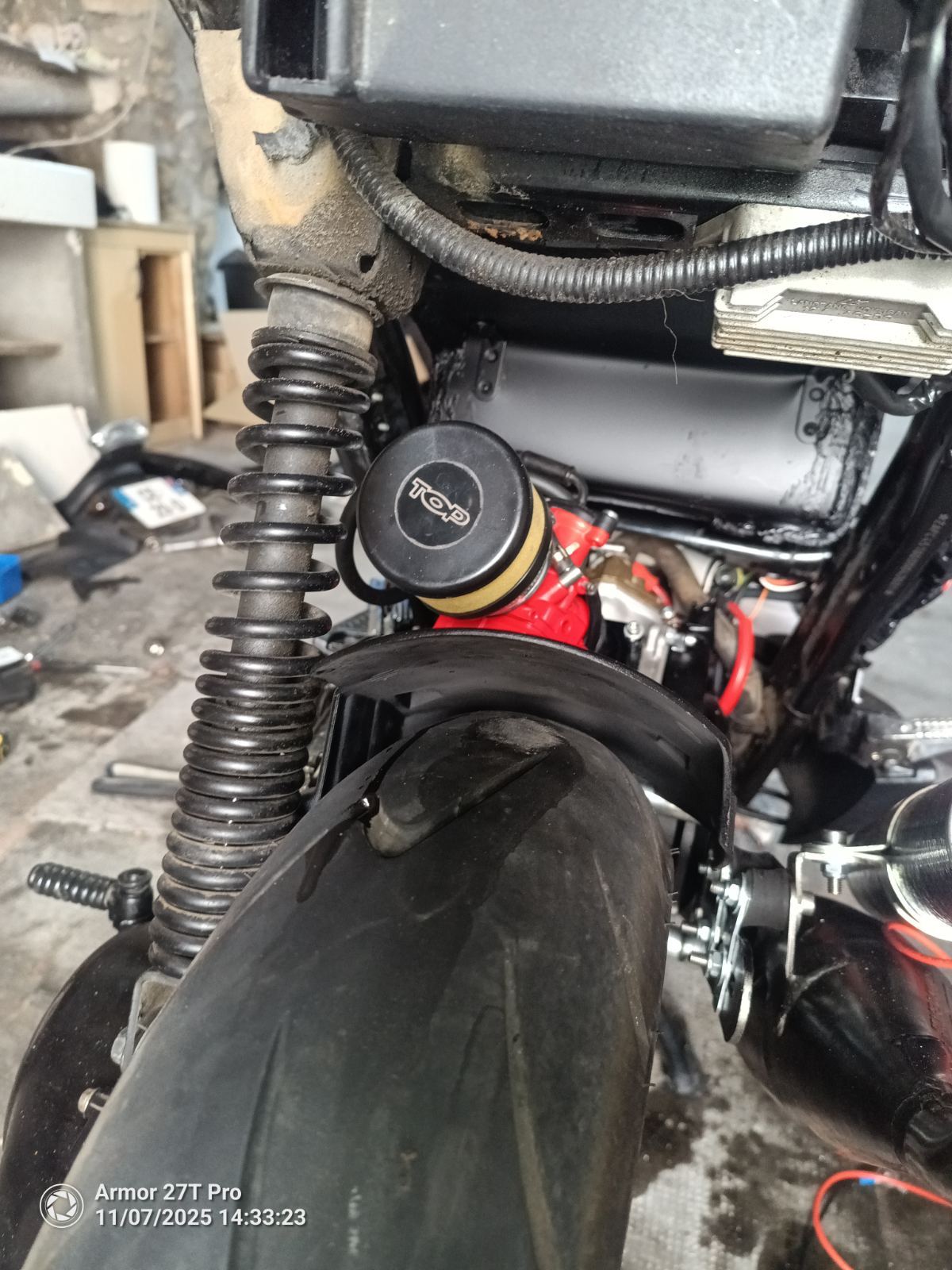 Salut, quelques news Je galère toujours sur la partie électrique, j'ai rajouté le fameux régulateur de booster mais je n'ai toujours pas de phare fonctionnel, pas de démarreur non plus d'ailleurs J'ai réussi à trouver le schéma de cablage du régulateur électrique et un plan du faisceau à peu près juste, je vais devoir chercher le problème à coup de multimètre, à tous les coups j'ai oublié un câble 😅 J'ai rajouté une pipe orientable au lieu de la pipe droite, ça me permet de remonter le garde boue arrière mais le réservoir aurait quand même touché donc j'avais pas le choix que de le couper J'ai fait un petit tour avec le scoot, sans aucun réglage (carburateur jamais ouvert) et c'est très prometteur, je pense qu'avec un gicleur un poil plus gros et un cran d'aiguille de plus ça sera perfect. Côté variation il y a moyen que je ne touche à rien du tout: galets 3.7, ressorts d'embrayage Polini durs règlés à 70% du maxi, ressort de poussée noir Malossi (plus dur que celui fourni avec le correcteur malossi). J'aurai juste à confirmer que la courroie atteint le haut du variateur D'ailleurs difficile de faire un rodage tellement ça gueule dans les tours 🤣 Dès que j'ai trouvé mon problème électrique je remonte le tout et ça sera finito !