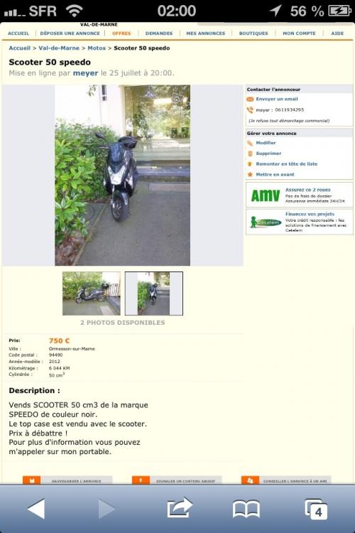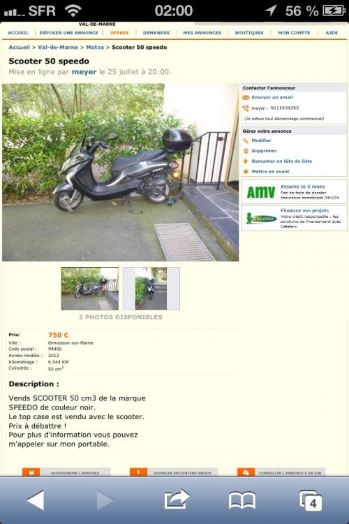 5. alors voilà rentrons dans le vif du sujet, je vais acquérir un Speedo 50 année 2012 5000km, et en très bon état générale très bien entretenue par une personne âgée, pour 600 euro, mais le hic dans cette histoire c'est que c'est une marque chinoise, mais moi je m'en fou, dans mon entourage tout le monde me dit de ne pas le prendre, vous qu'est ce que vous en pensez ?? http://www.leboncoin.fr/motos/510926547.htm?ca=12_s