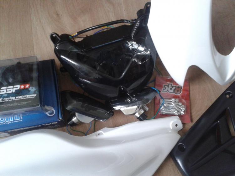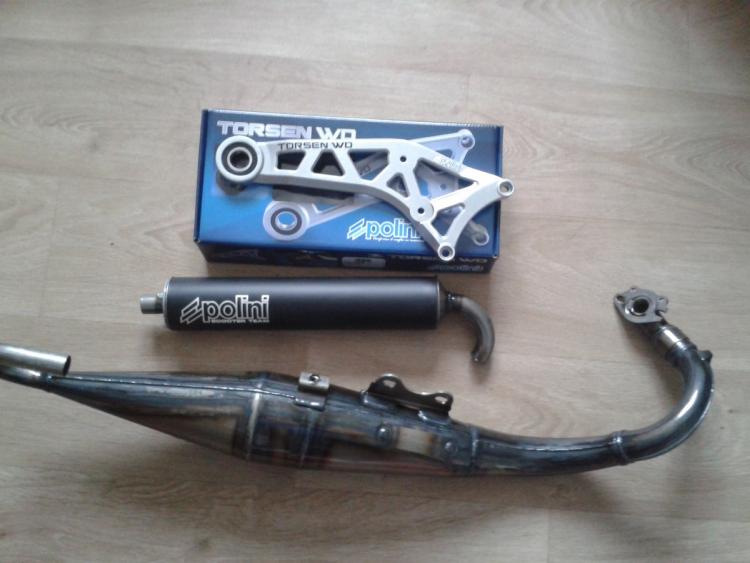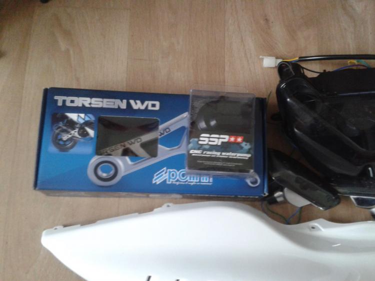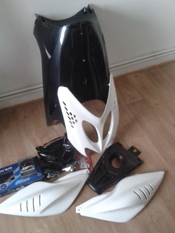 Voilà enfin des news, j'ai passé une grosse commande de pièces et de produits d'entretien sur MXS et aussi celle que j'ai faite sur le BCD shop car pas dispo chez MXS et voici la liste: Chez BCD Shop: Poignée rouge, leviers de freins blancs, capot de maitre cylindre rouge, feux arrière RX blanc (il sera modifié par la suite), et un filtre raptor blanc que je mettrais sur le carter Top Perfs Chez MXS: Carter de kick Top Perfs, rocher de kick, entretoises du carter bouchon d’huile chromé Stage6 SSP, des marqueur de pneus blanc pour mes futurs Michelin 2CT bras moteur stabilisateur Polini "TORSEN WD" MBK Nitro, Couvercle de pompe à eau noir mat Stage6 + volute "Racing" H.T pression +40% Couvercle de batterie ODF en blanc, je pensais qu'il était en plastique hors il est en métal Carter de kick Top Perfs, rocher de kick, entretoises du carter bouchon d’huile chromé Stage6 SSP, des marqueur de pneus blanc pour mes futurs Michelin 2CT bras moteur stabilisateur Polini "TORSEN WD" MBK Nitro, Dosseret de selle Kiesler Evo Phare avant avec le fond noir, et les clignotants avants à leds aussi à fond noir Les ailes arrière STR8 en blanc, face avant STR8 blanche ça c'est pour les pièces et voilà pour l'entretien du scoot: un nettoyant nanotech pour le scoot, un spray anti-buée pour le casque, un pti kit de nettoyage casque et visière bien utile Je me suis commander aussi un nouveau pot Polini Team 3 pour bien aller avec le bras Torsen et un bas de caisse DMP carbone mais sur d'autres site de vpc place aux photos ci-dessous -