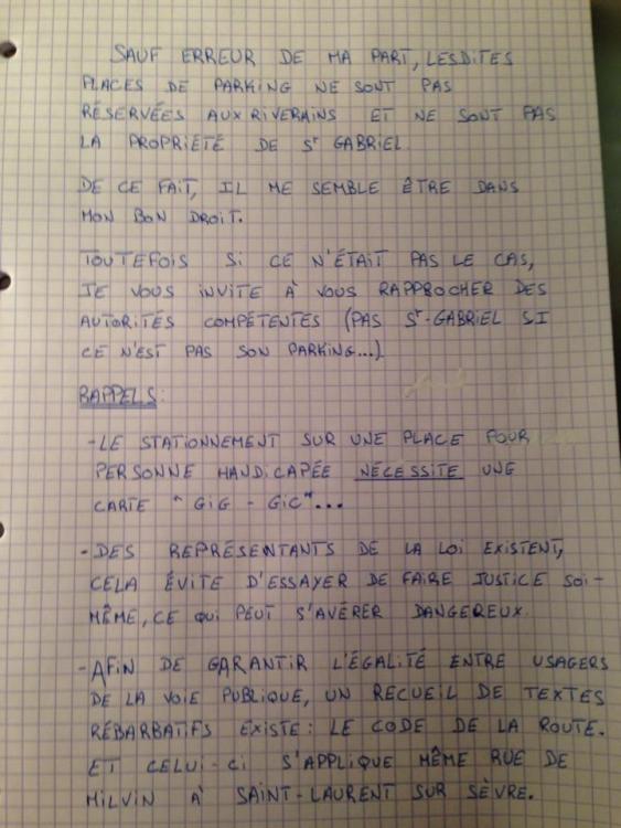 Salut à tous ! :) J'ai un problème de stationnement aux abords de mon école, accrochez vous, ça vaut le détour... Je vous plante le décor : Dans une commune de 3500 âmes, se trouve mon école nommée Saint-Gabriel, pour se garrer, depuis qu'ils nous (Les étudiants de l'école supérieure) ont changé de batiment, c'est un peu le bronx. Le directeur, lors de son speach de début d'année, nous a donc dit de nous garrer sur l'ancien parking qui nous était réservé, sur le parking de la mairie ou ailleurs dans le village tant que l'on respectait le code de la route... Les parking étant loins, j'ai pris pour habitude de me garrer, dans une petite rue derrière l'école, sur une petite rangée de places de parking délimitées au sol par des bandes blanches. Il y a déjà de ça quelques semaines, alors que je sortais de la voiture, une dame dans sa voiture, s'arrête et m'interpelle, elle habite à deux pas de ces places de parking. Elle me dit qu'elle travaille à l'école, que les étudiants ont des parkings à leur disposition et que la place sur laquelle je viens de me garer est réservée aux riverains. Je lui explique respectueusement que le directeur de l'école supérieure nous a dit qu'on avait le droit de se garer ailleurs que sur les parkings et que la place sur laquelle j'étais, il n'y avait aucun marquage, aucun panneau indiquant qu'elle était réservé aux riverains... Je n'ai pas déplacé ma voiture, il me semblais et me semble toujours être dans mon bon droit. Elle a donc fait marche arrière ... Pour se garer sur une place GIC GIG ( Ou handicapé si vous préférez. ). Je continue de me garer sur la même place, et à la fin des cours, tadaaaa : Donc je ne me laisse pas impressionner, à 20 ans, c'est pas une prof qui va me dicter ce que j'ai à faire en dehors des cours... Donc je rédige un petit papier que je scotch sur ma lunette arrière durant toute une journée, dans l'espoir qu'elle le lise. Tout ça, c'était il y a quelques semaines. Cet après-midi, en cours, le directeur de l'école supérieur vient me chercher et me dit que le grand directeur de l'école veut me voir. Je le rencontre, et il me dit que la mairie l'a appelé car ma voiture est stationnée sur des places réservées aux riverains, et ce pour la deuxieme fois en 15 jours. Il en a donc assez de passer du temps au téléphone et me dit que la prochaine fois, ce sera fourrière et 300 euros pour récupérer la voiture. Donc il décide que l'on aille voir ensemble où est garée ma voiture. Et une fois devant la voiture, il dit ne pas comprendre... Car pour lui aussi, à priori, ces places ne seraient pas réservées à qui que ce soit, nous avons vérifié ensemble si il n'y avait pas un panneau... Il m'a quand même demandé de bouger ma voiture, ce que j'ai fais et de ne plus me garer là. Ce que je ne pense pas faire... Quelques détails : le maire est prof d'EPS dans l'école, la dame qui souhaite que je laisse la place aux riverains et qui habite à deux pas travaille aussi à l'école, et il n'y a aucune restriction au stationnement de visible sur ces places... J'insinue rien du tout, vous en déduisez ce que vous voulez.... :siffle: Mes questions sont donc : -Est-il possible que ces places soient réellement réservées aux riverains sachant que la route qui passe devant est publique, ce n'est pas une voie privée. -Est-il possible que ma voiture finisse en fourrière alors que celle-ci est garré sur une place sur laquelle il n'y a aucune indication informant que ces places sont réservées à qui que ce soit... -Que ferriez vous à ma place ? Je ne tiens pas à me laisser faire, pour le principe, car tout le monde doit jouir de ses droits et aussi parce que je prends un café chez un pote qui habite au dessus de ces places de parking le matin. :lol: Désolé pour le pavé, mais faut bien cadrer l'histoire. Merci pour vos réponses. :)