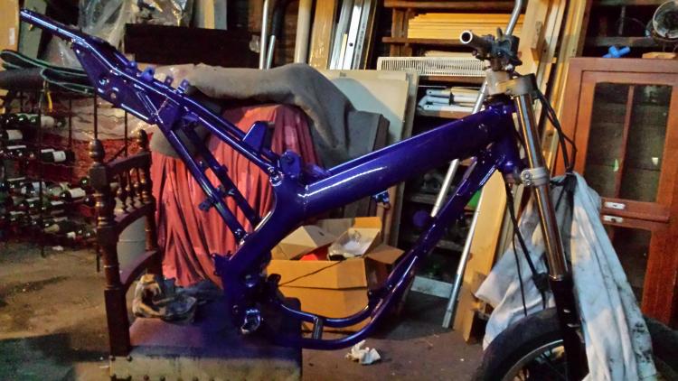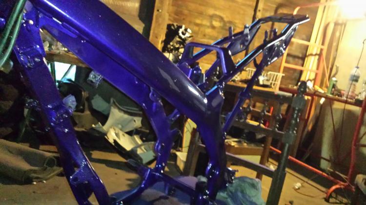 En atendant le debut du montage a blanc sa donne sa ( vivement les carénages et la peinture ) une idée pour la couleur ? je pensait a un Gris métal avec des stickers sobre Ou full black avec la plaque blanche devant et les coté blanc a l'arrière et des numéro genr le chifre 7 mon préfféré haha et des stickers qui corespondent a mes pièces ( tout en restant sobre et épuré ) je déteste le jacky contrairement a ce que l'on peut croire avec ce cadre en violet Des avis ??? personne suis ? -
