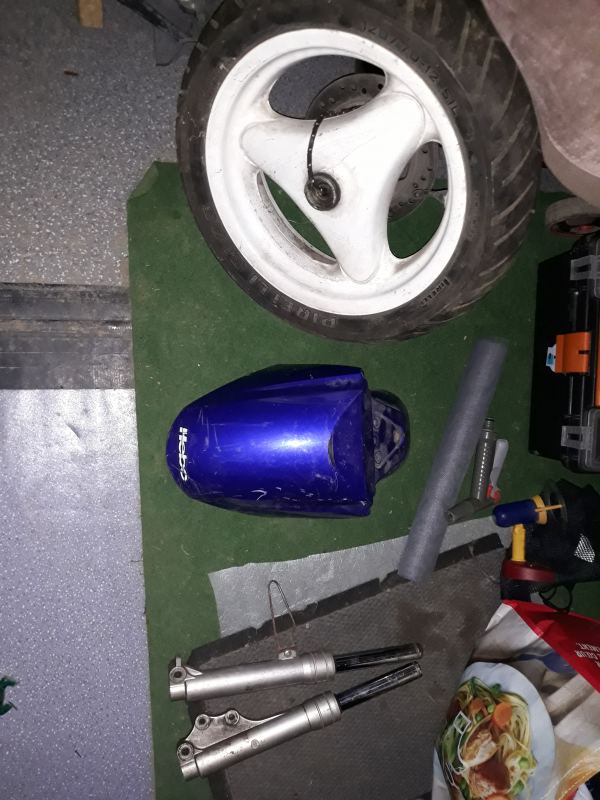 Le pneu sur la jante est lisse mais j'ai le disque et l'entretoise d'axe avec d'où il y a un élastique dessus pour la tenir . Sur un des fourreau il manque le cache poussière sinon ils sont complet et le garde boue bah c'est un garde boue lol pas de fissure ni rien .(toujours bon à prendre ) Je pense mettre de l'huile de fourche neuve et nouveau spi et cache poussière comme ça hop je les montes sur le neos . -