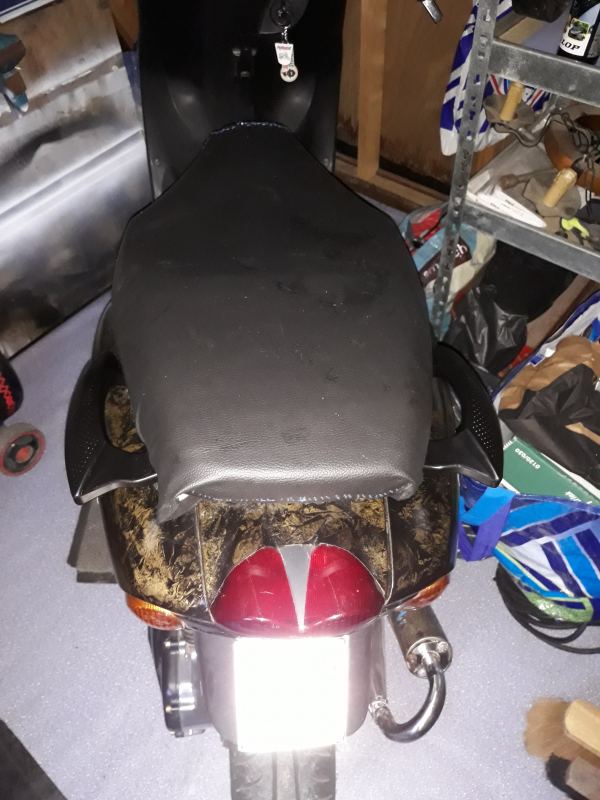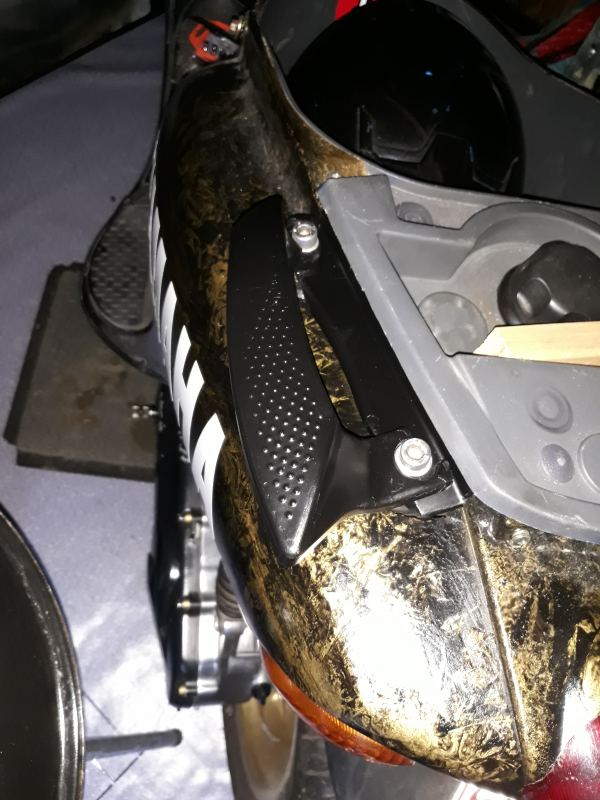 5. Oui une belle choucroute hein !! je comptais remettre une boîte neuve car en+ j'ai l'impression qu'il bouffe trop d'air . Régler le carburateur aussi car il reste haut en régime Sinon, j'ai posé le 2éme pose pied passagé et adapter pile poil (je ferai de même avec celui déjà posé) Petite découpe (à la scie à métaux s'il vous plaît) et ça passe crème : une fois posé : et sans le bas de caisse car je devais partir et pas envie qu'il se barre lol