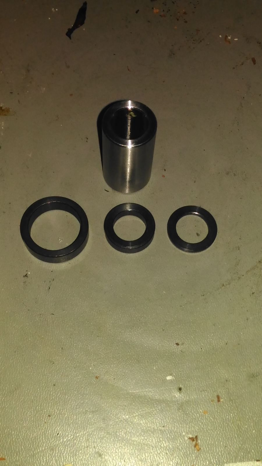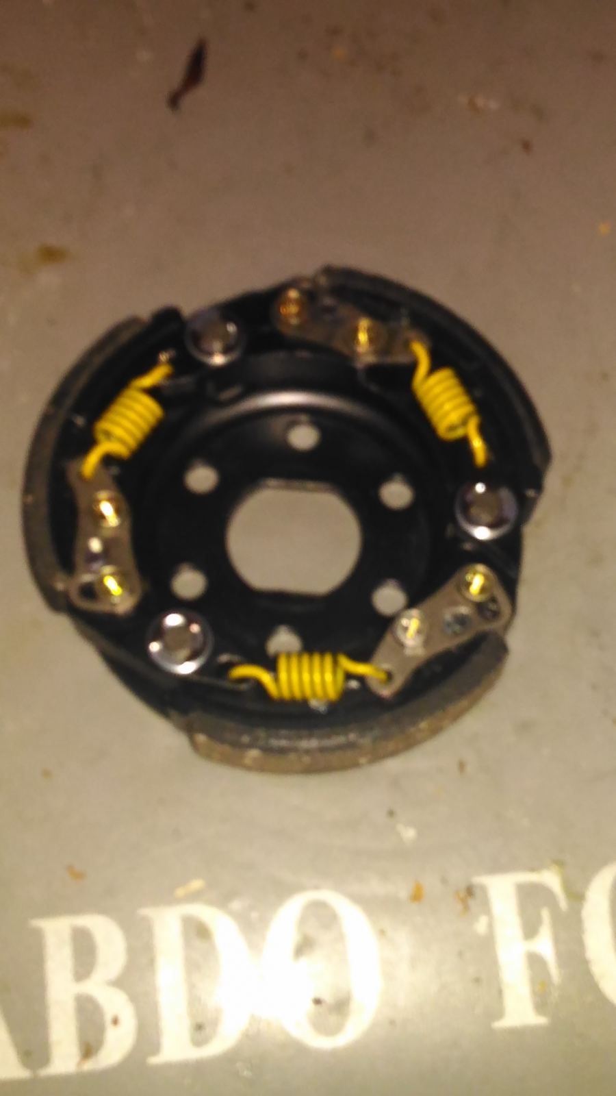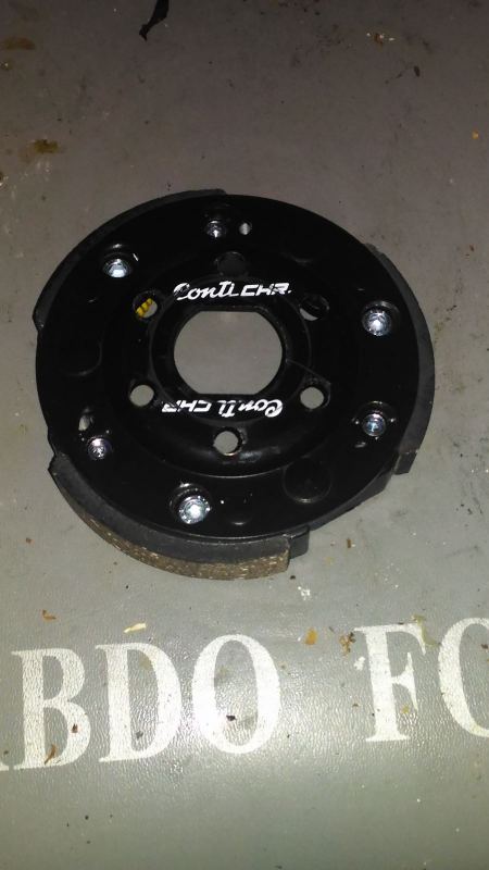 Voici le canon du variateur, il rentre dans la rondelle de gauche, les 2 autres sont du même diamètre que le canon mais une est plus épaisse. Laquelle mettre? (celle de droite est un peu plus épaisse que la rondelle du variateur origine)! Voici l'embrayage il est bien réglable en tension par une vis (la plus grosse btr) elles sont serré à fond mais je n'est pas eu de notice, comment l'utilise t'on? -