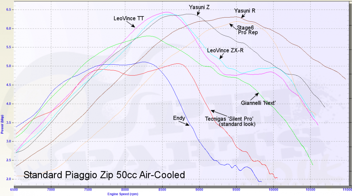 12. pour t'aider a choisir ton pot voici pour un zip en kit origine (motorforce) débridée de partout (cdi bride a 10 000 rpm stock) attention ce sont des courbes en variation "libre"(comme si le scoot avait une boîte en gros pour voir la puissance selon le régime) c'est sur le site de pedparts.uk section guide si tu veux lire l'article tout ces pots sont testé sur des kits 70 aussi ) pour ton pote c'est révision complète ++