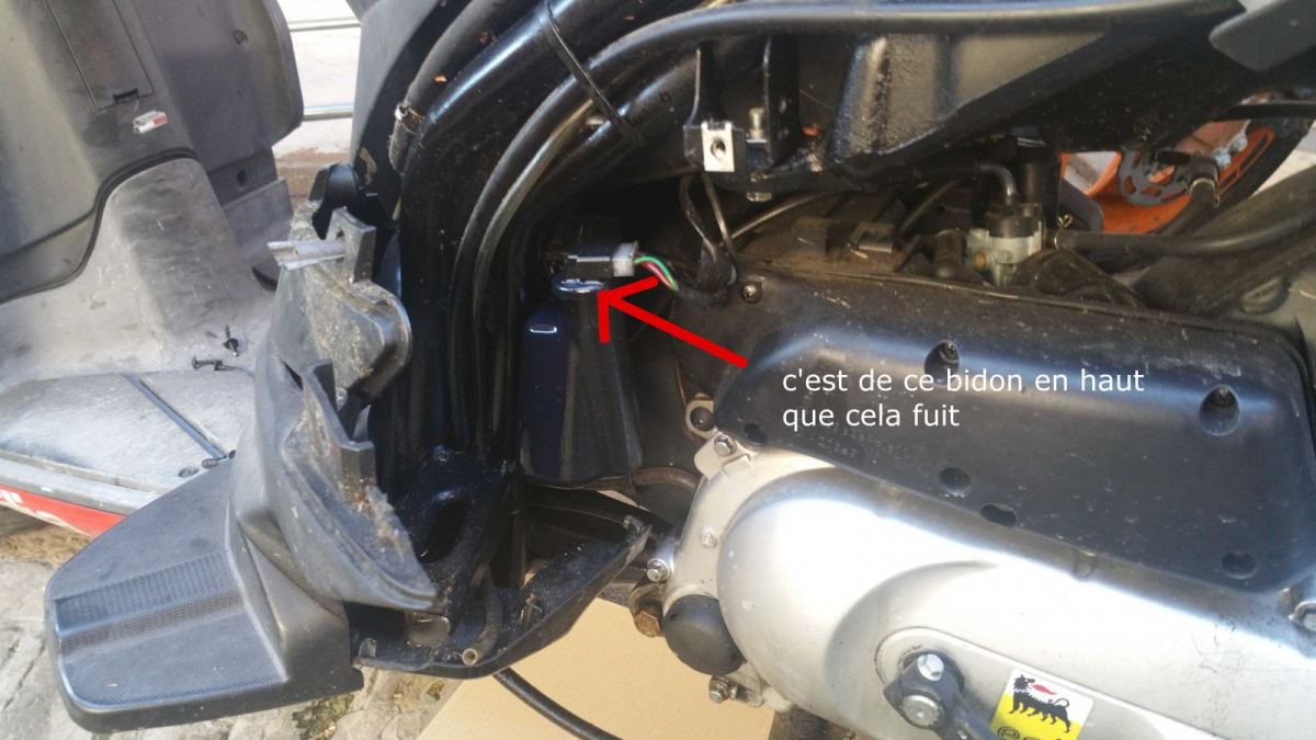 2. Bonjour, Je viens vers vous pour une fuite mais je ne sais pas ce que c'est...je vous mets une photo pour mieux comprendre...La couleur de l'huile est rougeâtre...Je ne sais pas a quoi sert ce bidon.. le scooter est un Aprilia sr motard 50. Merci à vous !