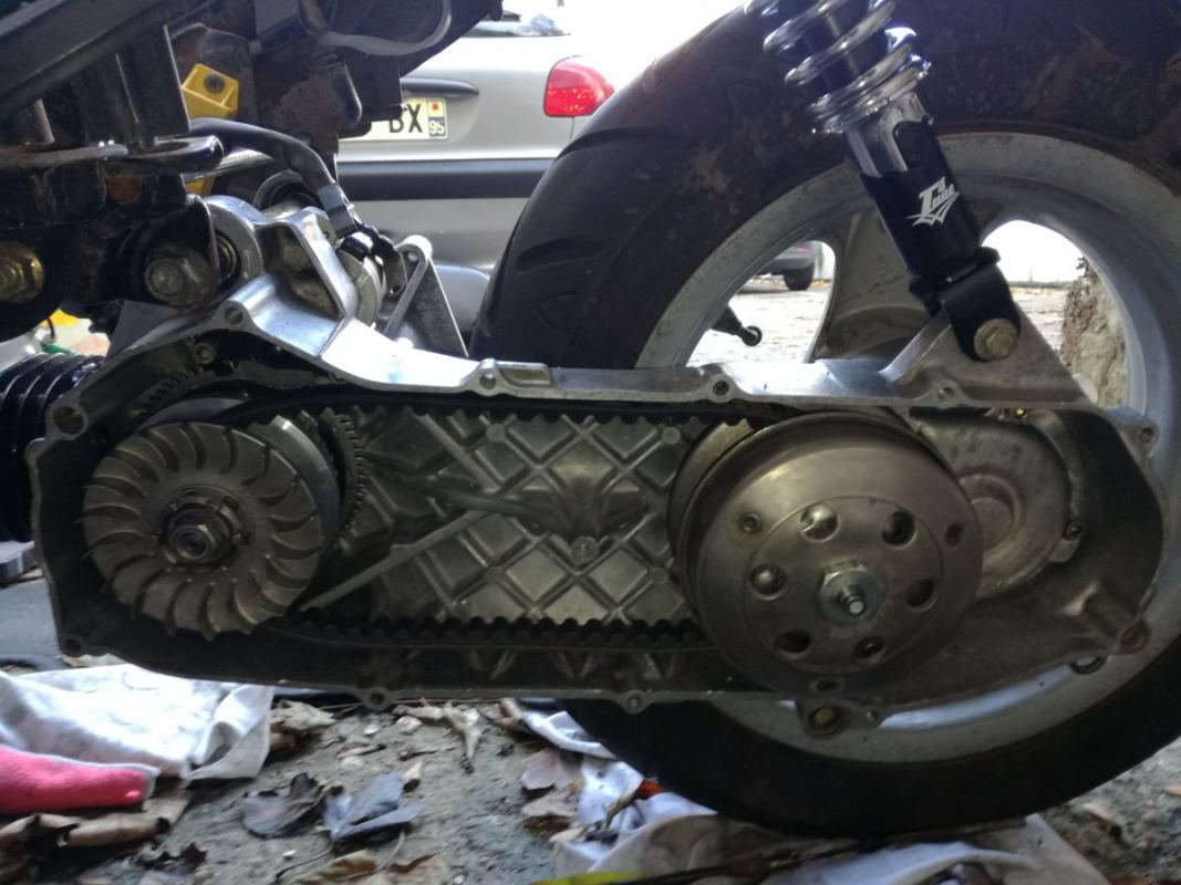 Rendre étanche fil électrique, rizlan et ranger fil Réglage carburateur, aiguille cran milieu, gicleur 92, nettoyage carburateur. Création bouchon sur carburateur ( ancienne durite pompe a huile ) elle n étais brancher sur rien la pompe et réservoir huile étant enlever, ça devait sûrement mettre le bordel dans mes réglage carburateur. Nettoyage durite et branchement Huile transmission mise Bon il reste à nettoyer ce côté de la roue Nouvelle turbine ventilation mise Reste à trouver un obturateur de pompe ou le fabriquer et un petit bouchon en caoutchouc, pour boucher le trou du carter côté allumage. Carénage dessous, côté, arrière posé avec branchement clignotant. Nettoyer et ranger zone de travail. Protéger variation, allumage. Prochaine étape Nettoyage boîte à air, filtre à air malossi neuf. Pose boîte à air. Remettre système de frein arrière, les réglé. Remplacement liquide de frein avant, purge. Nettoyage roue avant. Poser phare avant neuf avec ampoule led. Réglage phare. Nettoyage carter kick, ponçage, peinture carter kick couleur argent. Une fois sec graisser et monter carter kick. Voir si le temps, decalaminner pot, poncer pot, mettre antirouille, peinture haut température. Montage pot. Nettoyer, poser cache moteur et allumage. Nettoyage scooter, mélange, croiser les doigts et démarrer le kteos.. Nan malheureusement car il est complètement à sec.. Plus une goutte d essence -