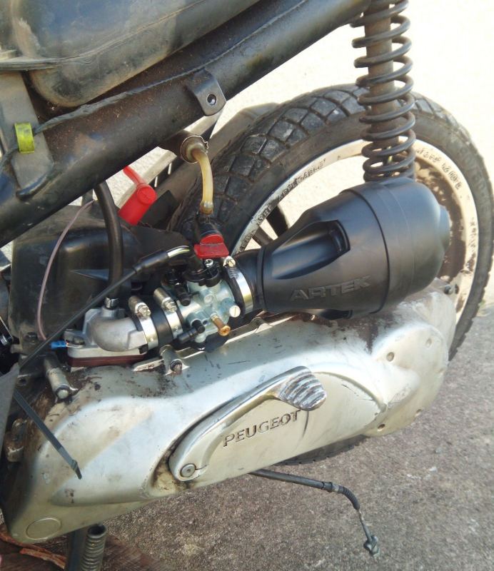 Bonjour à tous. Je viens de retaper un Peugeot Looxor 50cc. Voici ce qui est neuf: - joints moteur complet - cylindre + piston (modèle d'origine fonte) - échappement (modèle d'origine) - pipe d'admission - filtre à air Artek - carburateur 17.5 Actuellement, voici mes réglages: - boîte à air, 2 prises d'air ouvertes sur 3 - pot bridé ! - gicleur de 70 - vis de ralenti dévissée de 0.5 tour - vis de richesse dévissée de 2.5 tours Je tourne au mélange, un peu trop d'huile je pense vu la fumé qui sort du pot. Impossible de régler avec la bougie, j'ai pas mis de bougie neuve, celle installée est vieille (le culot est bien noircit). Le scooter tiens le ralenti en galère environ 20sec puis s'éteint. Le moteur broute un peu pour se lancer, a moitié régime, si je coupe, il a un peu de mal a se relancer. Je fais mes test roue en l'air ! Impossible de rouler sur la voie publique pour l'instant. Merci. -