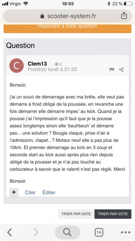 j'ai un souci de démarrage avec ma brêle, elle veut pas démarre à froid obligé de la poussée, en revanche une fois démarrer elle démarre impec’ au kick. Quand je la pousse j’ai l’impression qu’il faut que je la pousse assez longtemps sinon elle ‘beuhbeuh’ et démarre pas... une solution ? Bougie claqué, prise d’air à l’admission, clapet...? Moteur neuf elle a pas plus de 10km. Et premier démarrage au kick en 3 coup et seconde start au kick aussi après plus rien depuis obligé de la pousser et je n’ai pas touché au carburateur à savoir que le ralenti n’est pas réglé. Merci