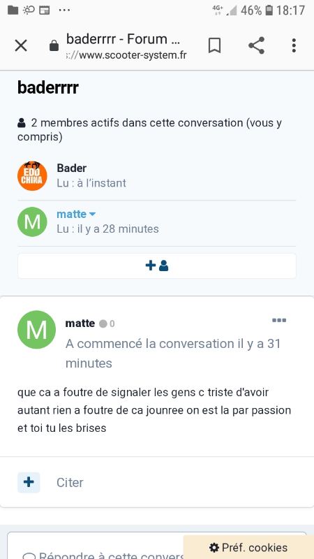 Bonjour Ceci est un mp reçu de notre amis qui n'as pas pris le temps de lire le règlement général du forum avant de poster, à juste titre il à été gratifié d'un avertissement, et voilà la réaction d'un adolescent pris en flag . Pour te répondre non je ne t'ai pas signalé mais averti directement et je n'y est passé la journée mais quelques secondes j'ai certains réflexes vu que je suis modérateur depuis plusieurs années si l'ont considère mes différents pseudo. Le mieux pour toi et de réagir en adulte assume ce n'est pas compliqué non ? En plus c'est virtuel ici tu risques de finir au gnoufs . Et n'insiste pas avec moi si il faut te bannir 25 fois je le ferai.
