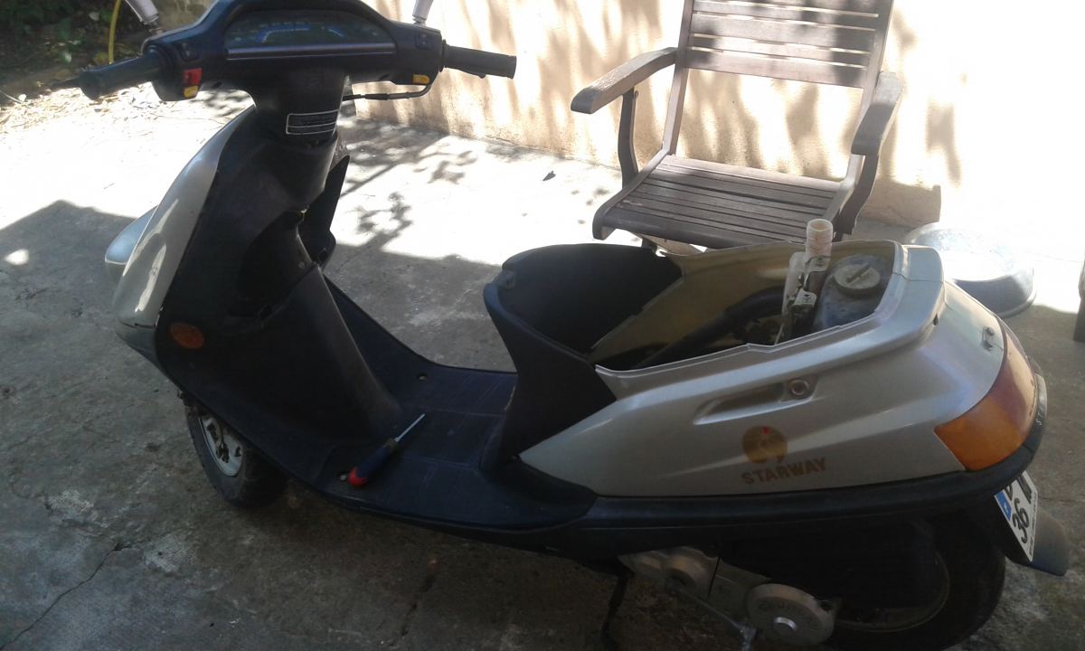 Ces un starway chunlan 50cc 2T de 2011 j'ai fait pas mal de recherche sur internet mais je n'ai absolument rien trouver sur cette marque ces pour cela que je poste ce sujet ici n'ayant pas les moyen pour l'amener au garage ni les connaissance pour résoudre le problème seul, le scooter n'avais pas rouler depuis 6 mois il démarre niquel (au kick) accélère ne broute pas et monte parfaitement dans les tours comme si je rouler a 50 .