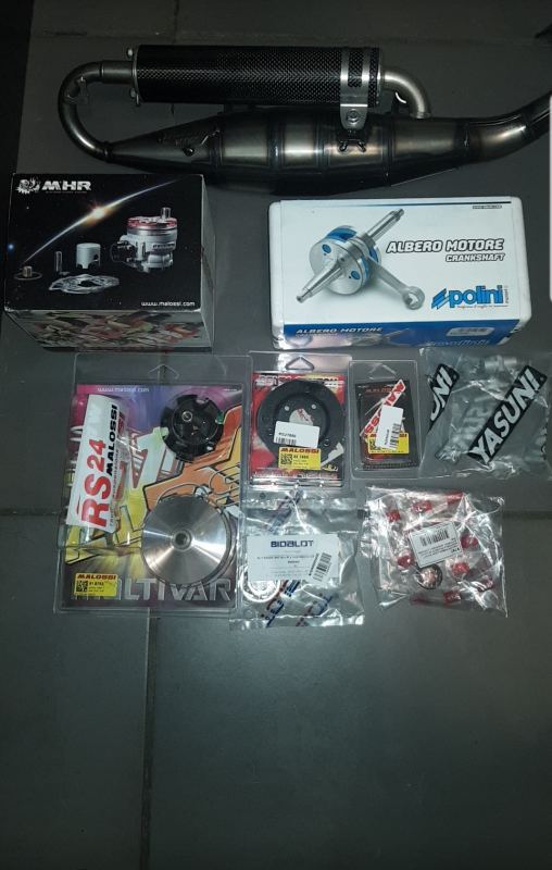 Il te faut anbrayage malossi delta .Variateur multivar malossi . Vibrequin for race polini . Kit 70 mhr malossi . Roulement cages à aiguilles de chez bidalot joint spi et corner pour boîte à air Le pot c dommage il fallait prendre le yasuni r et pas le z car c de la merde a coté le z sur la photo c le R carbone il faut absolument retirer les bride il faut pas oublier que dans la cartouche du pot il y a osi une grosse bride