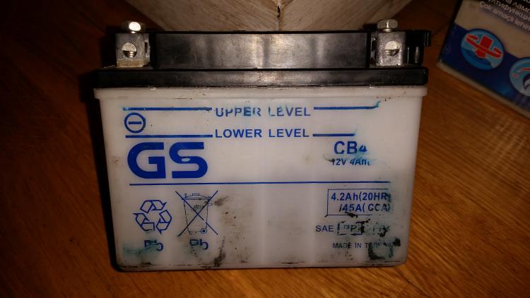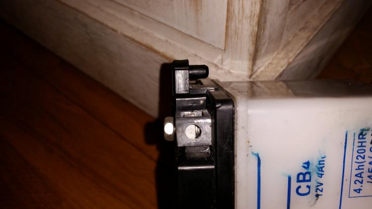 3. Voilà mon ancienne batterie. Elle a les des bouchons au dessus. Mais il y a un embouts pour mettre une durite, je suppose que c'est la vidange donc je peux pas la toucher. Il paraît que les batteries gel on peut les coucher?