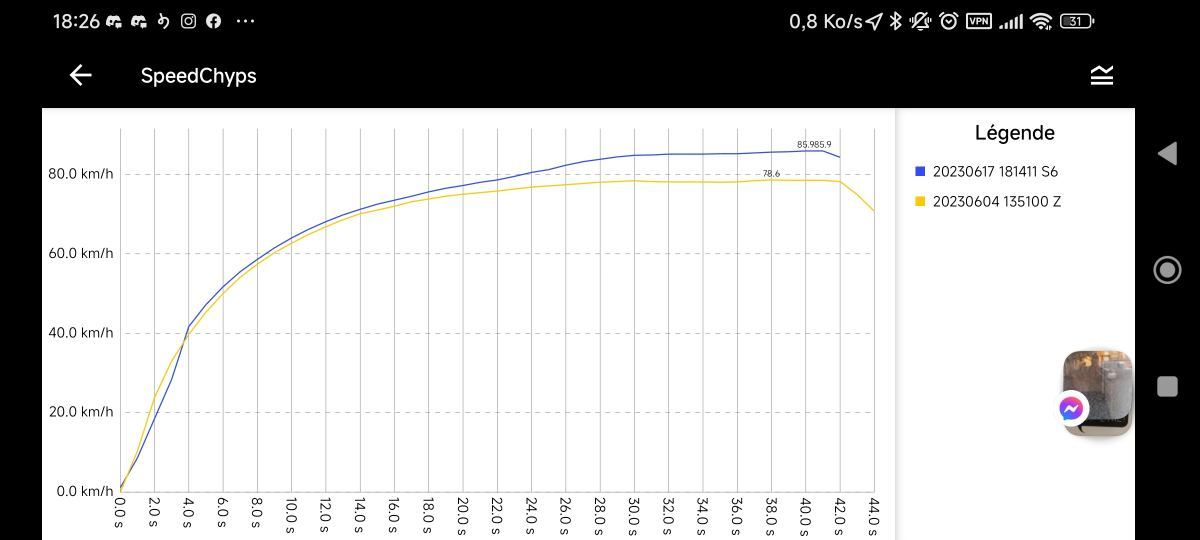 Mouais, la première pièce mais mettre un pot qui s'accorde à l'origine quand on change le moteur bah.. Ça colle plus forcement Bref, qui a parler que mon pot était d'origine ? J'ai un s1r bidalot Baa "préparé" carburateur origine gp96 Galet 5.5, ressort embrayage jaune et blanc au convertisseur (égale origine en gros) Le machin prends en gros un ptit 80 gps sur le plat J'ai donc monté le "cylindre adaptable" hein Sur les courbes en jaune c'est avant et en bleu après (j'ai pas de plat, donc ça monte dans un sens et descend dans l'autre 1.5% environ) J'ai coupé sur la dernière, encore en rodage et ça commençait à prendre les tours Galet trop lourd, à vérifier mais le régime de puissance est autour de 9000 va falloir aleger le variateur et par contre ça embraye trop tôt et je vois pas ce que je peux monter comme ressort Mais bon, ce n'est pas le sujet ici et puis visiblement il y a rien à changer. -