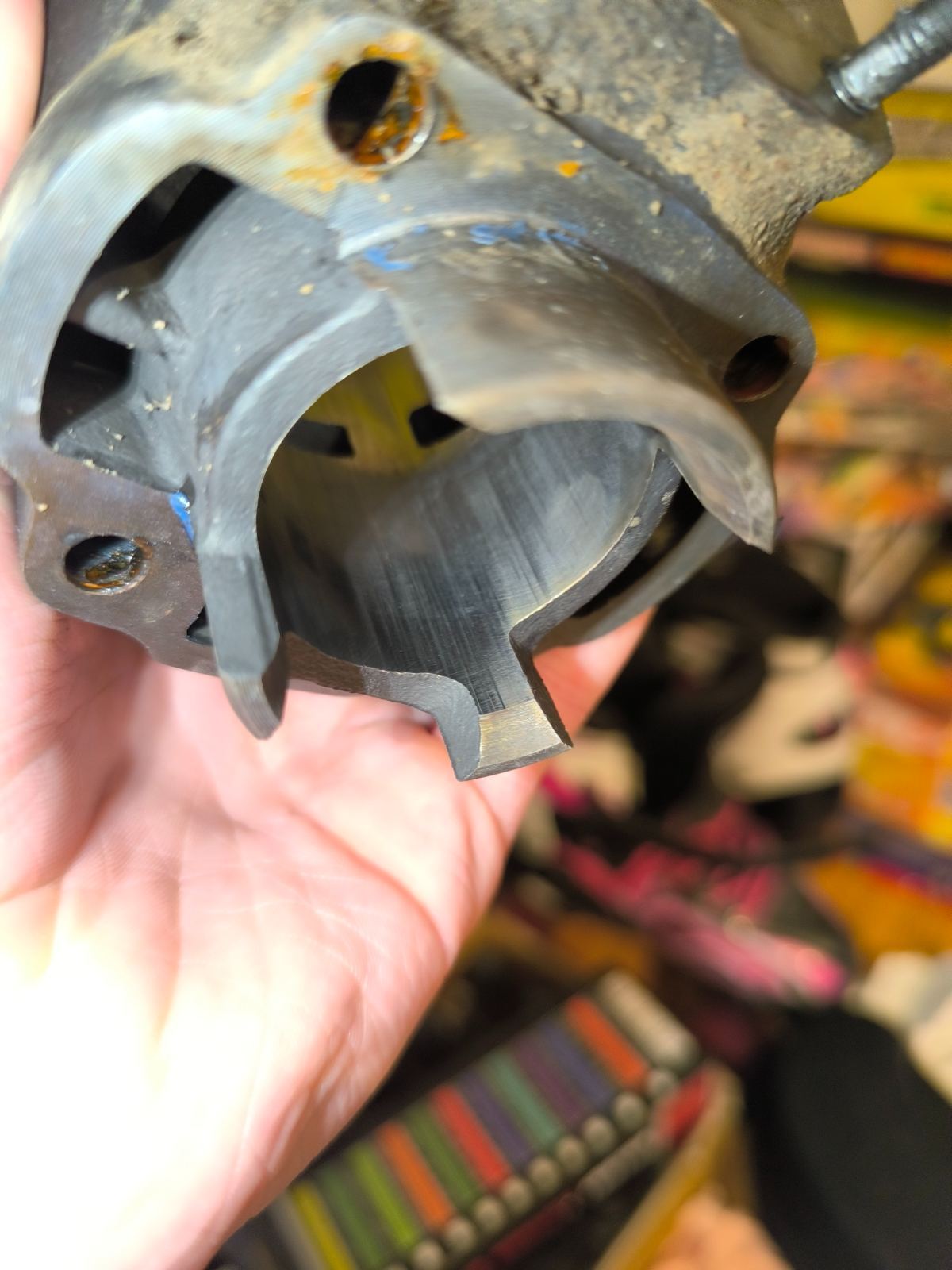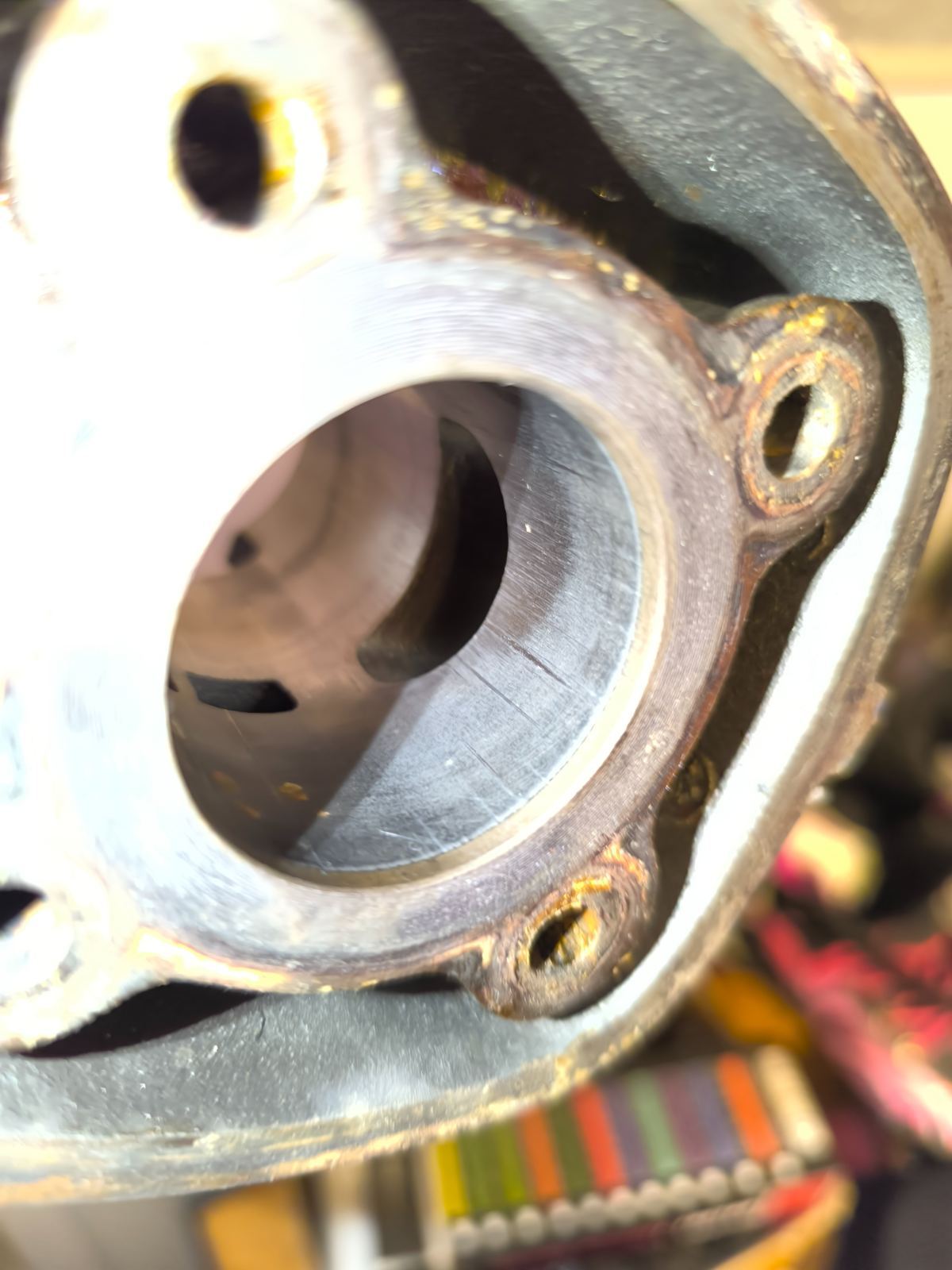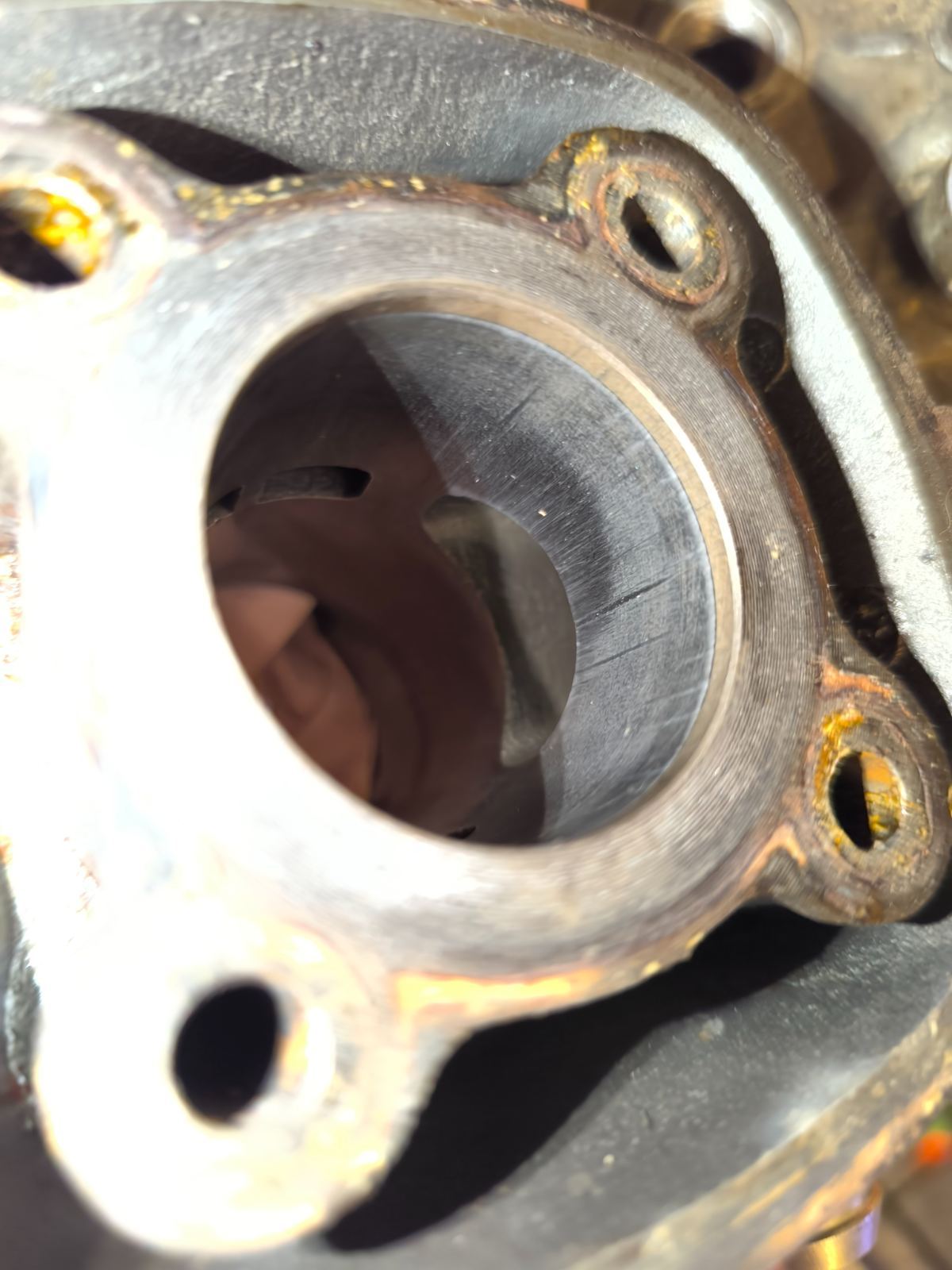 Voici les photos du cylindre le piston a de la calamine et pareille que le cylindre sur le piston on voit que le scooter a fait un début de pressérage puis j'ai du coup toujours le problème on pensait a une bobine ou a un allumage carrément (on pense que l'allumage et d'origine donc au moins 25 ans ) Merci de me répondre Bonne soirée