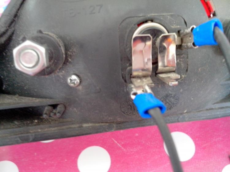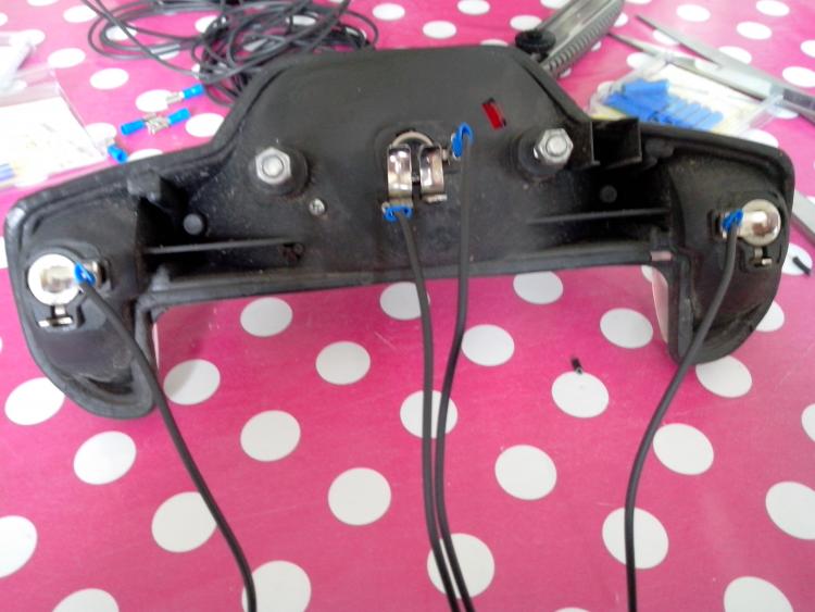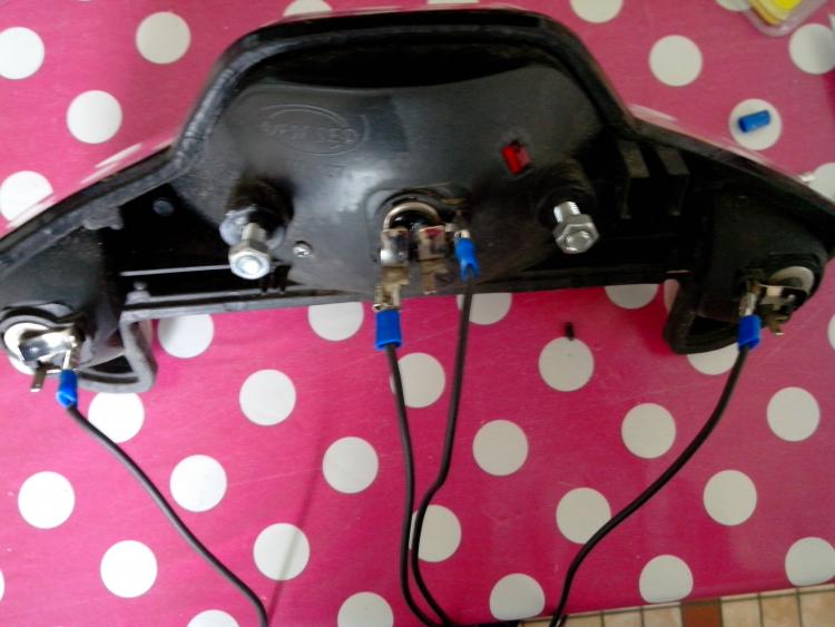 Bonjour, Besoin d'aide pour branchement feu arrière sur booster spirit de 2003. Il faut que branche ça: Noir >masse jaune/vert >feu Bleu >feu stop Marron >clignotant droit Vert >clignotant gauche Par contre voilà mon feux: Donc mon problème c'est que j'ai deux cosses par clignotant, et trois sur le feux central... :rheuuu: Donc en partant de la gauche vers la droite, sur photo numéro 1 par exemple c'est: masse, puis (déjà branché) clignotant droit au centre... ? et à droite de la photo: clignotant gauche (déjà branché) et masse???? :D2 Et deuxième question si il y'a trois fils avec la masse doivent-ils tous se rejoindre ensemble? :siffle: Merci pour votre aide et vos réponses -