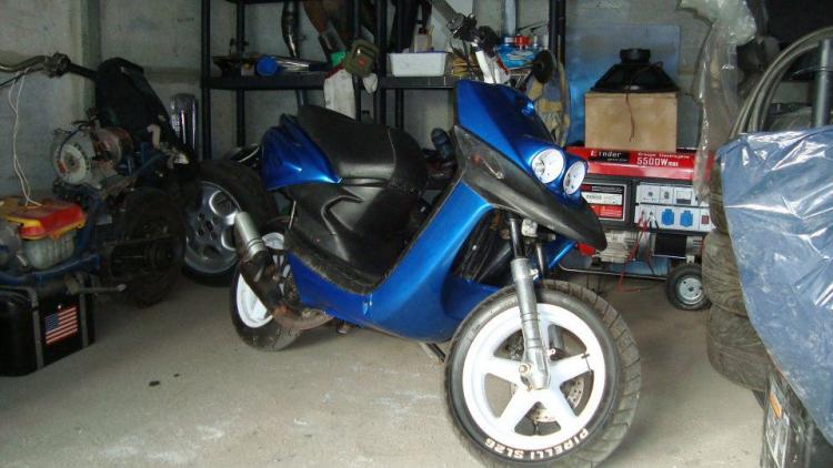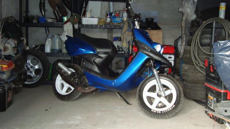 Merci, c'est pourqoi je ne me fait pas ch*er a sortir le pétard, sa prend moins de temps a la bombe et le résultat et trés similaire ;) EDIT : vu que vous étes brancher peinture je vous glisse les photo de mon précédent scoot, un rocket que j'ai refait entiérement a neuf : Il s'agit d'un bleu dans le ton des bmw m3 e36, fait a la bombe avec de la peinture de chez norauto , la peinture compléte ma coûter moins de 100e (beaucoup de boulot néanmoins sur les carénage) -