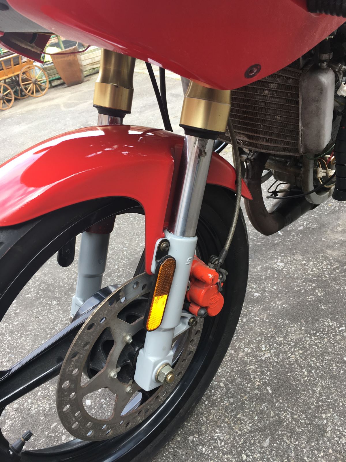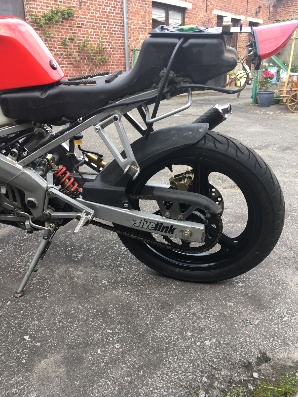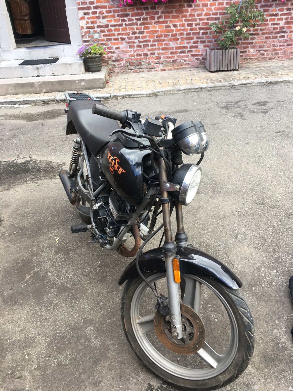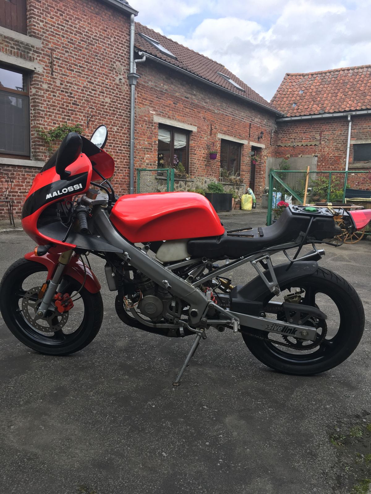 17. Déterrage du sujet ! Bon le projet avance lentement, le retour des beaux jours me donnent du travail pour divers client du coup ca avance moins vite. Sinon, j'ai démonté mes fourreaux de fourche et ils sont tous les deux pliés.. la mert' ! Du coup en cherchant sur le net, j'ai trouvé une épave de GPR à 100€ (les fourreaux coûtant déja 80-90€) Bref j'ai sauté sur l'occasion ! Ca m'a permit de changer les fourreaux, remettre les réservoir d'huile et d'eau d'origine, le cache chaîne maquant, la pédale de frein arrière, le garde boue avant en état d'origine Ca fait plaiz ! J'ai du repeindre le garde boue qui bien moche. Le rouge n'est pas exactement le même que d'origine mais ca le fait quand même et j'ai donné un coup de gris sur les fourreaux! Comme j'ai tous démonté, j'en ai profité pour remettre les supports de pose pieds arrière qui sont bien plus propre pour fixer la cartouche de pot. J'ai aussi roulé avec la moto pour la ramener à l'atelier chez mes grand-parents et suivi par mon frere en voiture.. Et bien j'ai fais un bon 110 compteur voiture, et d'après lui un bruit magnifique Pour finir, avec mon frere on a acheter un Derbi Fénix pour 80€ a l'état d'épave et un senda donneuse d'organes, notre but est de la passer en Café Racer. Si ca vous dit je mettrai quelques photos. AU passage oui j'ai Bien profité on a eu 18 degrés en fin janvier.. que demander de plus