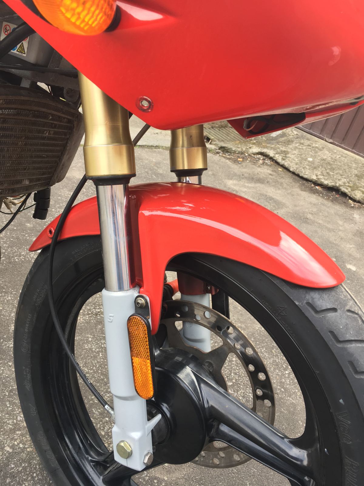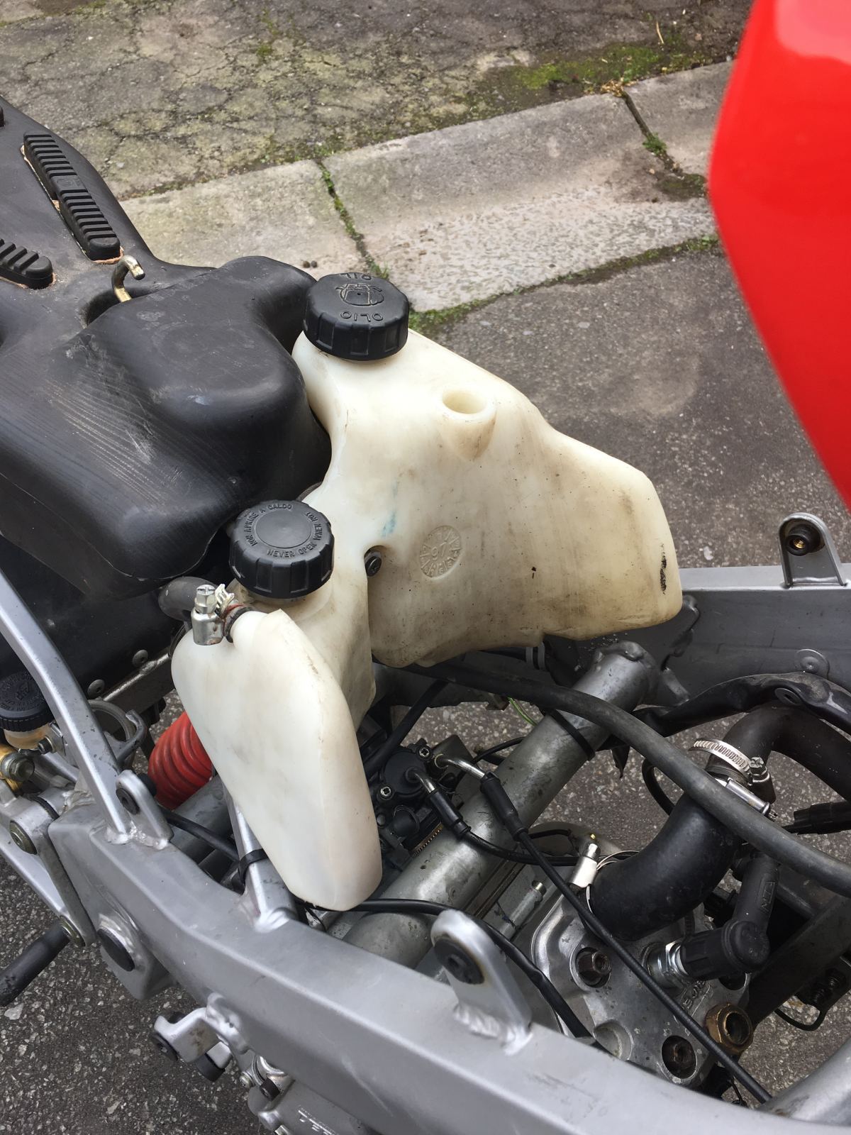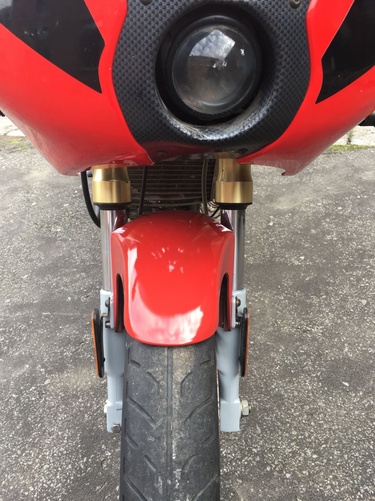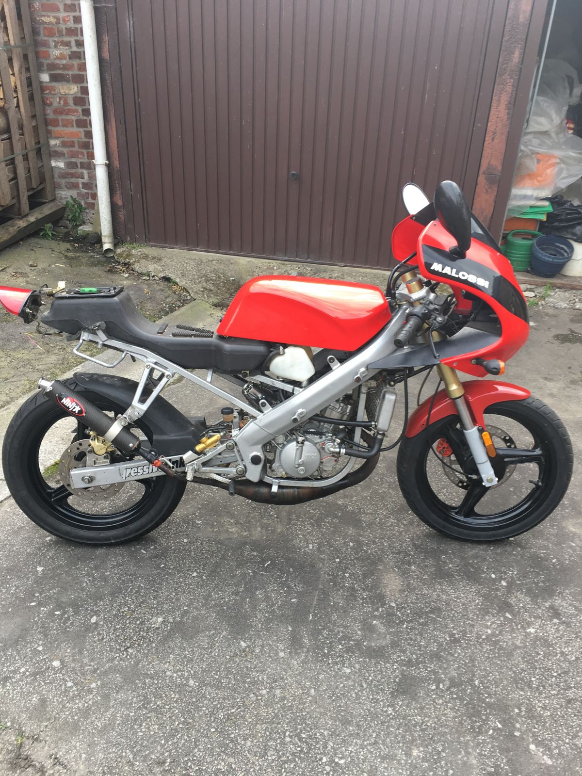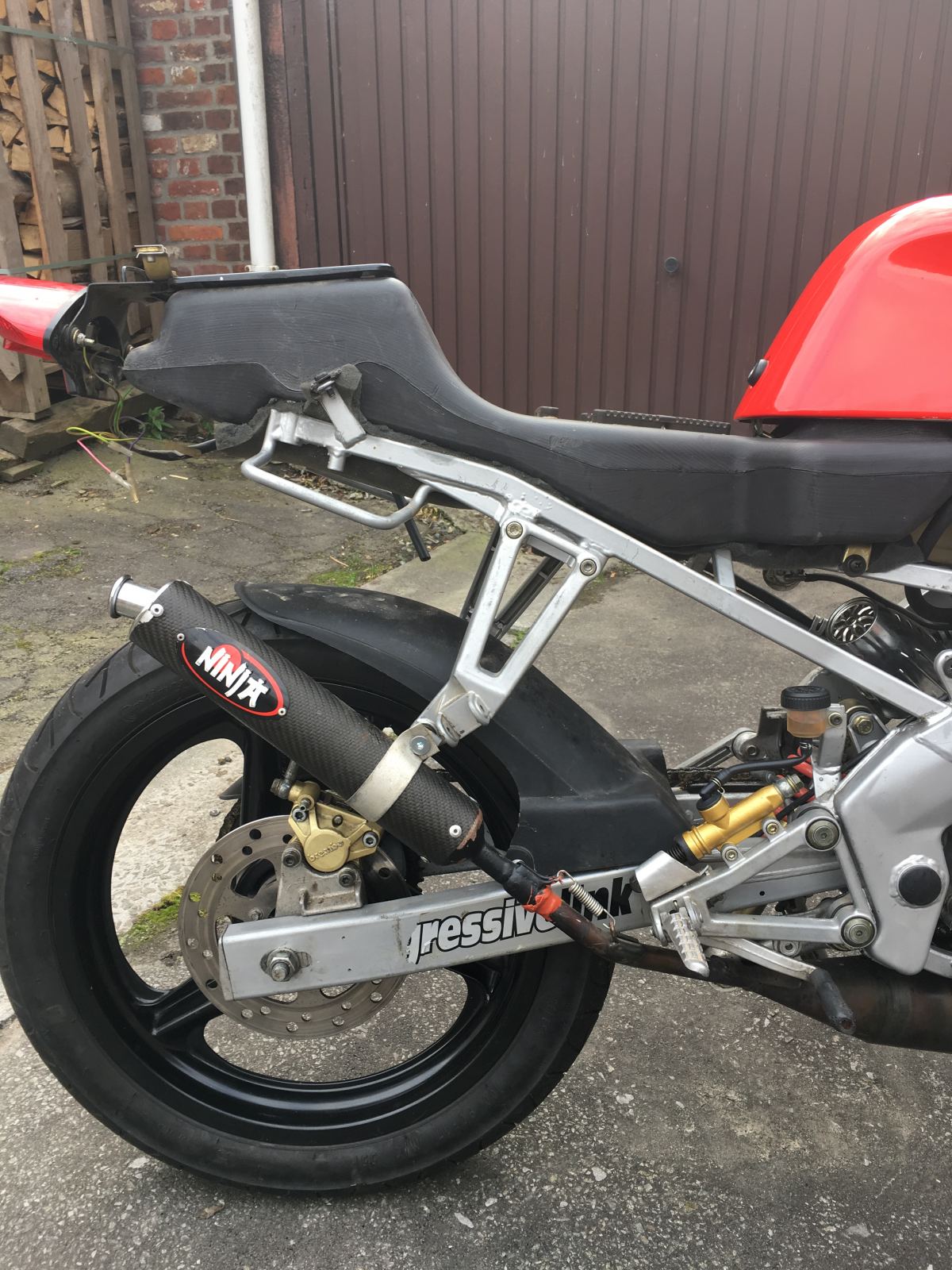17. Déterrage du sujet ! Bon le projet avance lentement, le retour des beaux jours me donnent du travail pour divers client du coup ca avance moins vite. Sinon, j'ai démonté mes fourreaux de fourche et ils sont tous les deux pliés.. la mert' ! Du coup en cherchant sur le net, j'ai trouvé une épave de GPR à 100€ (les fourreaux coûtant déja 80-90€) Bref j'ai sauté sur l'occasion ! Ca m'a permit de changer les fourreaux, remettre les réservoir d'huile et d'eau d'origine, le cache chaîne maquant, la pédale de frein arrière, le garde boue avant en état d'origine Ca fait plaiz ! J'ai du repeindre le garde boue qui bien moche. Le rouge n'est pas exactement le même que d'origine mais ca le fait quand même et j'ai donné un coup de gris sur les fourreaux! Comme j'ai tous démonté, j'en ai profité pour remettre les supports de pose pieds arrière qui sont bien plus propre pour fixer la cartouche de pot. J'ai aussi roulé avec la moto pour la ramener à l'atelier chez mes grand-parents et suivi par mon frere en voiture.. Et bien j'ai fais un bon 110 compteur voiture, et d'après lui un bruit magnifique Pour finir, avec mon frere on a acheter un Derbi Fénix pour 80€ a l'état d'épave et un senda donneuse d'organes, notre but est de la passer en Café Racer. Si ca vous dit je mettrai quelques photos. AU passage oui j'ai Bien profité on a eu 18 degrés en fin janvier.. que demander de plus