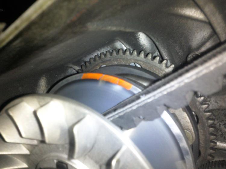 Salut. Ton pro est un rigolo. Tu peux tester avec deux paires de galets de poids différent, mais en temps normal, il faut 6 galets du même poids. De plus, le poids est vraiment mal répartit (des 6 et des 4g, je veux bien, mais 3.5 et 7, qu'il change de métier). Regarde la trace sur ton variateur, elle doit être marquée jusqu'en haut, comme sur la photo ci dessous (elle doit encore grappillée un peu sur la partie orange, mais tu vois le principe, il doit rester un écart de quelques millimètrès) : -