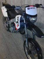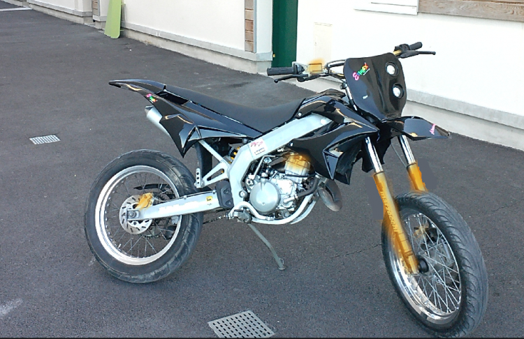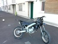 Salut tout le monde :) Je vais vous présenter mon projet pour ma Derbi xrace de 2007 acheter l’année dernière. Donc quand je l'ai eu elle était toute d'origine il y avait juste un pot Polini for race 2 mais elle roulais déjà bien :) La voici à l'achat: Puis après j'ai monter un kit 70 Airsal avec un carburateur 19 Dell' Orto, bac Malossi vl6 et filtre à air Polini. Et sa tourne bien :) La voici avec la bavette enlever puis avec un peu d'autocollants: Puis le 13 août je suis tomber a 90 km/h en faisant un guidonage :vener: ça va que j’étais a coter d'un champs de maïs et que je suis tomber dedans mais malgré ça j'ai eu une fracture de l’humérus (bras) et la moto avait le guidon tordu, levier d'embrayage casser, carénages griffer et neiman casser. Donc j'ai remplacer les carénages par des tnt noir avec une plaque phare tnt type cross et un guidon tnt couleur or. La voici en ce moment: Et j'ai pour projet de peindre les étriers en or, de polir les leviers de freins et d'embrayage, polir la fourche ou la peindre en or, peut-être changer les jantes, puis peindre des détails en or. Tout ça se fera doucement et les polissages se feront lorsque mon bras sera rétabli (pas avant octobre) Bonne visite ;)