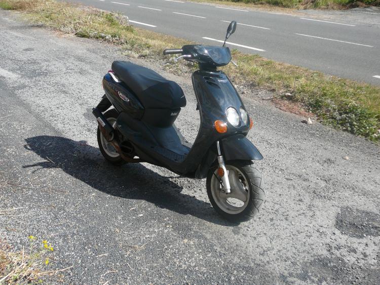 Bon, le premier objectif c'était de remettre le scoot en route et qu'il soit utilisable au quotidien, donc fiable avec un investissement minimal, j'ai donc privilégié les éléments mécaniques au détriment de la carrosserie. Une restauration c'est pas donnée, voici un chiffrage simplifié : _scoot > 50€ _cout pièces détaché neuves > 385€ _ pot gianneli extra d'occase > 20€ _ Total > 455€ Donc pour ceux qui veulent ce lancer dans ce genre de projet ça peut donner une idée. Sinon après quelques week-end de boulot voilà le bestiau. Moteur : _ cylindre Airsal alu type origine (échappement venturisé et poli). _ culasse doppler neuve (volume chambre 4.5cc, squish plat de 1mn) _ mousse rouge malossi _ écope de refroidissement _ carburateur 12 gicleur 80 _pot giannelie extra Transmission :_ galets 5.5g (trop lourds) _ ressort de poussée malossi jaune Partie cycle : _ béquille latérale RMS (sur laquelle j'ai beucoup a dire) à part ça il est entièrement Stock.