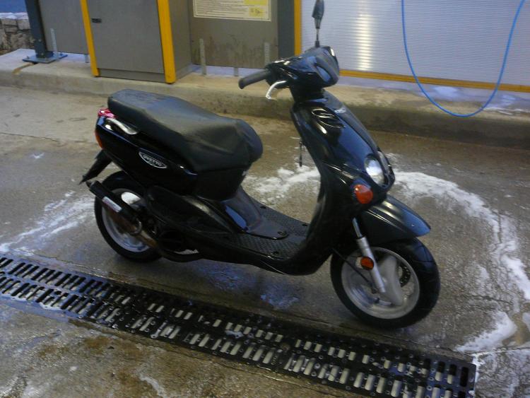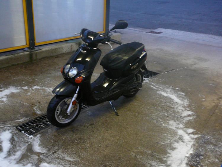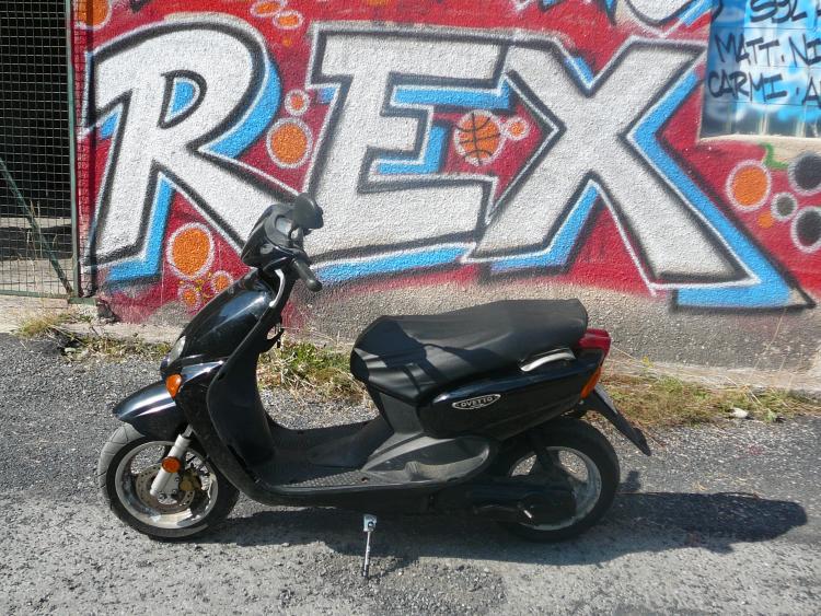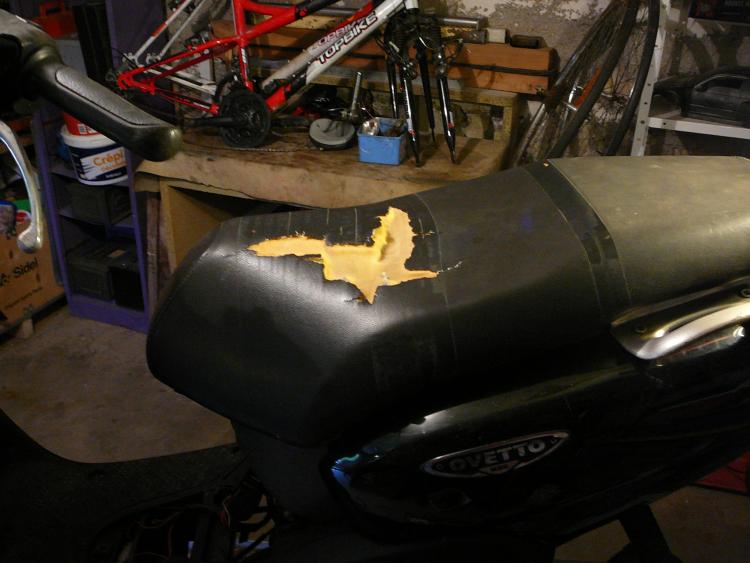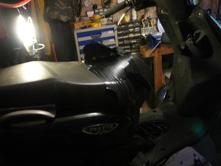 Bonjour a toutes et a tous, bienvenues sur le topic de mon Ovetto. C'est une machine que j'ai acheté il y a 1 an pour 50€ a l'état de quasi épave mais entière. Descriptif lors de l'achat : _ Carrosserie a moitié démontée _ Frein AR bloqué + pneus AR crevé _ Béquille centrale pété _ Pot TTP racing pété au niveau du coude (merci la béquille centrale) réparé avec des morceaux de canettes en alu et du fil de fer, résultat tout l'intérieur du scoot recouvert d'une belle pellicule de gras dégueu bien tenace. _ Selle déchirée _ GB AV pété _ Moteur non tournant (naturellement) Et encore plein de petits détails auxquels on reconnait une machine "bichonné" par son propriétaire. Le scoot était a la limite de partir a la benne. Voici les 2 seules photos que j'ai de la resto de l'hiver dernier (je sais plus pourquoi je les ai pris d'ailleurs), pas très démonstratives mais sur lesquelles on aperçoit des morceaux de l'atelier de mon pote Lolo sans qui tout cela n'aurais pas été possible, donc big up a lui. Je roule quotidiennement avec cette machine depuis le début de l'été, photos de son état actuel au prochain episode.