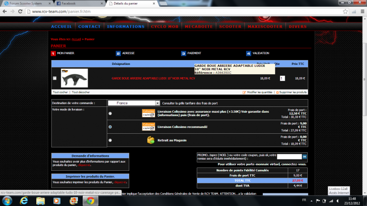 Flo-Rian Posté(e) le 23 décembre 2012 Auteur Signaler Posté(e) le 23 décembre 2012 Donc je vous mes les panier des commande qui vont dans l'ordre Alors ceux la sera en même temps et bientôt même tres bientôt :P2 Et plus tard mes dans pas longtemps aussi voilà et la peinture c'est pour refaire la face avant, la jante avant, la cadre, la trappe ou il y a la batterie et la barre passager a l'arrière :) 1