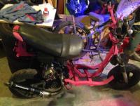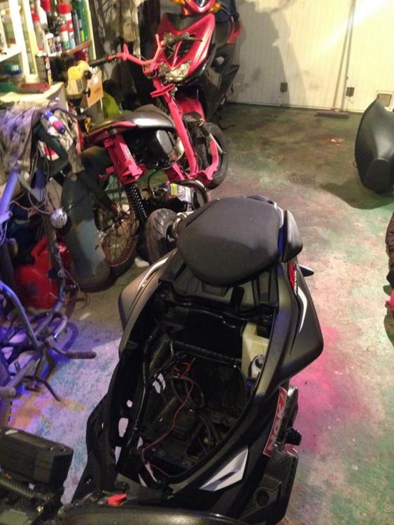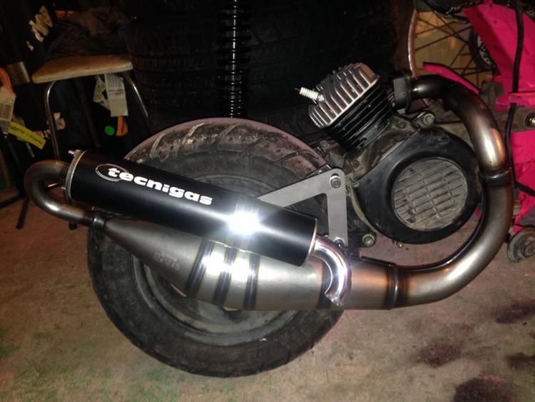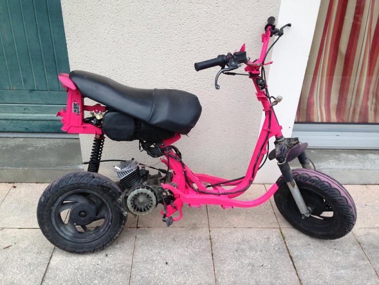 GoProto 13 Posté(e) le 11 janvier 2015 Auteur Signaler Posté(e) le 11 janvier 2015 (modifié) beaux boulot dit donc :cool2: j'avais vu que ton ammorto était légèrement plus large juste un conseil tu devrais mettre une rondelle des 2 coté pour bien centré J'ai mis une rondelle assez large. ;) Bon, ça à l'air de vous plaire, je continue. Après le réservoir, j'ai remis le faisceau, les freins et les poignées, petites photos dehors histoire de voir à quoi ça ressemble à la lumière du jour, c'est plutôt fun je trouve : Ensuite on pose les durites et le filtre à essence : On rebranche la masse sur les carters : On s'attaque à la bride du pot, c'était un véritable combat, à un moment le pot s'est mit à tourner autour de la perceuse, je me suis pris le pot dans le crane, j'ai cru que j'allais tomber dans les pommes ! Mais j'ai réussi à la déglinguer : J'installe le pot et là, gros problème, les fixations ne tombent pas en face : Bien énervé par ce fichu pot, je découpe la patte de fixation du pot d'origine, et grâce à un savant système d'entretoise, je pose le pot en définitif : Remise en place des caches du moteur, je trouvais ça fade en noir, j'ai collé des autocollants à l'arrache un peu dans le style stickers bombing (level -50 ^^ ) : Ensuite, je vais pour remettre le carter de kick, et là, gros problème, il touche l'admission, donc obligé de limer le carter pour que ça passe : Donc il ne me reste plus que les carburateur à installer. Donc je rappelle, le 19mm qui était sur mon Aerox va sur le Peugeot, et le 23mm de la commande va sur l'Aerox. Donc j'ai déjà posé les carburateurs, mais pour les deux scoots j'ai un problème avec la longueur du câble donc je regarderais ça le week-end prochain. Voilà les becanes : Edit : Pour la petite histoire, j'ai voulu vérifier si j'avais de l'étincelle à la bougie, je mets une bougie, je kick et rien, du coup j'ai ressortis tout mon faisceau électrique pour trouver le problème. Au bout d'une demi-heure, j'essaie avec une autre bougie, et ça fonctionne, je regarde les deux bougies, une a l'olive sur l'extrémité, l'autre non. Bref, sur le Zenith, il faut l'olive sur la bougie. ^^ Modifié le 11 janvier 2015 par GoProto 13 1