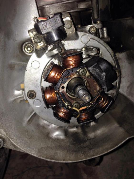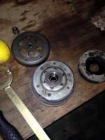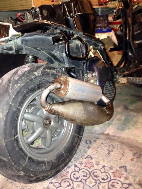 GoProto 13 Posté(e) le 23 mars 2015 Auteur Signaler Posté(e) le 23 mars 2015 Quelques nouvelles ! :D Bon, donc le frein, j'ai essayé, mais j'ai pas réussis à remettre le circuit en pression, du coup, j'ai laissé tomber. J'ai pris le frein avant du Forain, l'entraxe de l'étrier était le même, j'ai réussis à tout repasser correctement, le seul bémol, c'est que le maitre cylindre bloque un peu le couvre guidon, je verrais ce point plus tard : Sinon, on a bien avancé sur le pot, le tout avec du citron et des éponges vertes. Ca prend du temps, mais ça fonctionne, je trouve que c'est suffisant comme ça, la rouille sur le coude du pot est difficile à faire partir. Voilà, pour l'instant, ça reste comme ça, si j'ai envie, je pourrais toujours revenir dessus : Ensuite, j'ai changé l'embrayage. Histoire de limiter les coûts, j'ai récupéré l'embrayage d'origine du Forain, à gauche sur la première photo : Donc, j'ai ensuite testé le scooter, il a démarré sans difficulté. Donc, il fait un bruit de casserole, j'ai du rouler 30 mètres avec, car il est pas agréable à conduire. Sur un filet de gaz, le moteur accélère normalement, puis d'un coup, il se mets à accélérer. Enfin, c'est pas progressif du tout. Donc il va falloir que je mette de l'huile dans les gaines d'accélérateur, et que je revois la variation car je trouve que ça gueule beaucoup pour pas grand chose. Ensuite j'ai voulu attaquer donc j'ai démonté la cloche de l'allumage pour vérifier si tout était bon. A priori tout est à sa place ici, donc je pense que ça viendrait du régulateur de tension, mais il faudrait que j'en trouve un pour vérifier si c'est bien ça. Maintenant, il reste : -Régler le problème électrique -Régler la variation -Trouver un câble de compteur -Remettre une ampoule dans le feu stop. -Trouver un klaxon (Je me suis rendu compte qu'il n'y en avait pas) -... Bref, il reste du travail ! :D