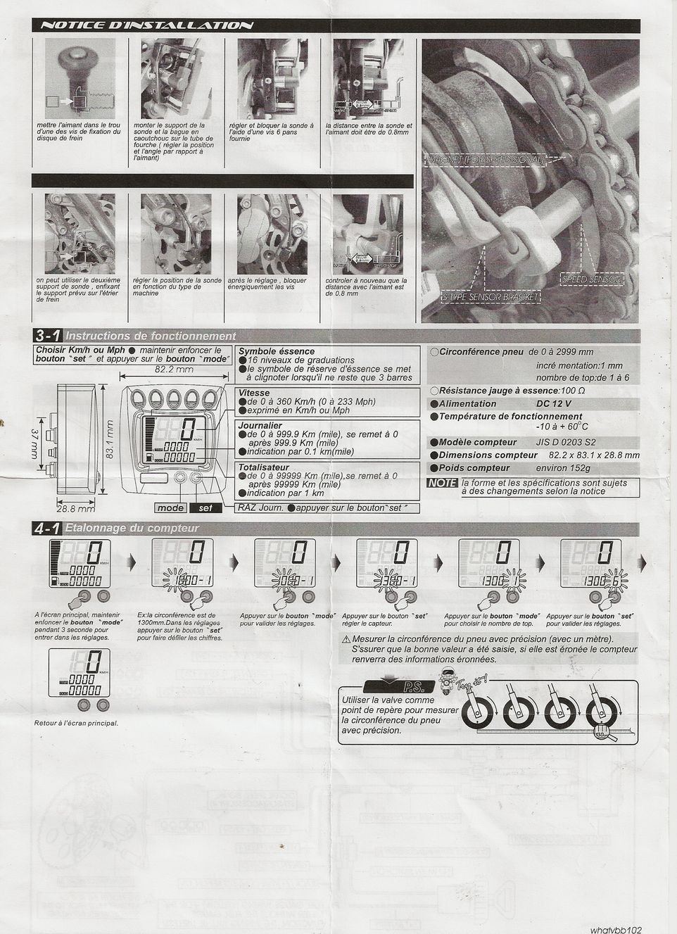 Je viens de mettre sur mon booster un guidon cross et un compteur digital " KOSO XR SA ", pour le programmer il faut mettre la circonférence du pneu, donc j'ai calculer celle-ci avec un mètre en faisant tourner ma roue et en regardant la valve. Je suis arriver à une dimension de 150 cm soit 1500 mm. J'ai rentré cette donnée dans le compteur sauf que après il fallait que je mette un " nombre de top " et je ne comprends pas ce que signifie le " nombre de top ". Voici la notice ci-dessous :