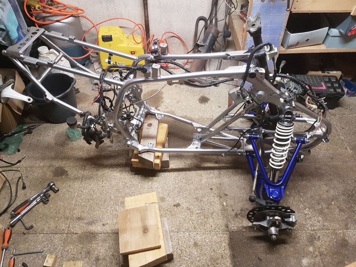 mat881 Posté(e) le 20 novembre 2017 Auteur Signaler Posté(e) le 20 novembre 2017 Salut, Donc j'ai reçu mes joints spi fin de semaine sauf que y avais que la moitié et comme par hasard ceux dont je m'en tamponne un max Bref obligé d'attendre ojd pour avoir ceux dont j'ai vraiment besoin, pour la colonne de direction ! Donc j'ai pu enfin commencer à remplir ce p*tain de cadre ! J'ai commencer par les spi de direction, le système de freinage, le faisceau principale et ensuite sur le train avant ; triangles, fusées et amortisseurs. Ensuite j'y ai ajouté les moyeux de roue avec les disques de frein. J'ai fixé les étriers avec plaquettes neuve. Train avant terminé et il me plait beaucoup ! Je pense que je vais y caler le moteur direct, vu que c'est accesible et qu'il pèse 46kg, autant le faire sans galérer avec tous les câbles. La suite bientôt