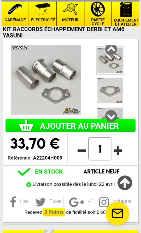 Mathis_nsm Posté(e) le 18 avril 2019 Signaler Posté(e) le 18 avril 2019 Bonjour , j’aimerais savoir si il est possible d’adapter un pot pour am6 à un moteur euro 3 (derbi) . Le pot est un pot bidalot et si c’est possible de l’adapter j’aimerait savoir avec quelle adaptateur.