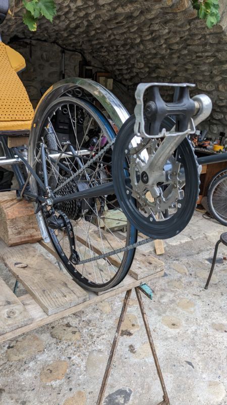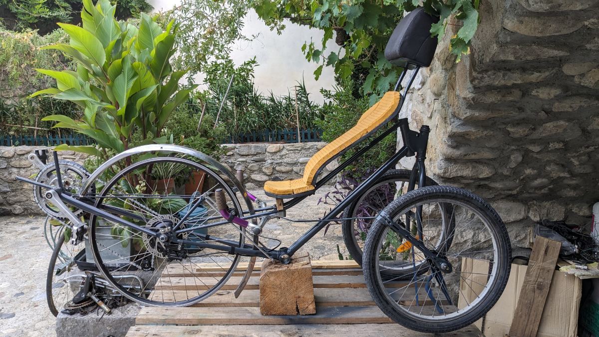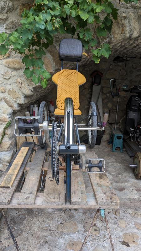 FRJMT Posté(e) le 29 août 2023 Auteur Signaler Posté(e) le 29 août 2023 (modifié) Aujourd'hui j'ai fait l'écolo : j'ai bossé sur mon proto de vélo couché à 3 roues... Je devais tester une nouvelle géométrie de direction pour éviter le ballotage à bonne vitesse... Ça roule super bien ! J'ai fait sensation en me baladant sur la voie verte !!! Je le teste encore, puis je le passe en électrique, je le carène un peu, puis je le peint dignement... Modifié le 29 août 2023 par FRJMT 2