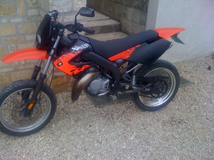 xReeed77 Posté(e) le 9 avril 2012 Signaler Posté(e) le 9 avril 2012 (modifié) Salut a tous, Donc je me refais un sujet car j'en ai pas refais depuis l'ancien forum. Alors j'ai une derbi senda sm x race de 2009 , je l'ai acheter neuve en aout 2010.Avant : Niveau moteur : Pot bidalot MXR carburateur 17.5 origine Gicleur de 100 Kit chaîne neuf 14x53 Niveau esthéthique: Feu arrière a led avec clignotant integrer Support de plaque fait maison rétroviseur f11 carbone Clignotant avant tnt Actuellement : Niveau moteur : Pot conti CHR Passage haut Kit 50 conti CHR EVO carburateur 19 Dell'Orto Transmission 14x53 Niveau esthétique: Plaque 450YZF Garde boue avant Racetech Halogene Wills Garde boue arrière Tun'R clignotant arrière supprimer Compteur origine enlever et remplacer par compteur vélo + support de voyant fait maison Feu arrière dans le passage de roue chaîne Conti Jaune Kit déco rockstar 100% Perso Poignées Pro Taper Rockstar J'hésite a prendre une mousse de guidon et quelques babioles, si vous avez des idées de modifs à faire hésitez pas :) Maintenant place au photo de la moto au début que je l'ai eu : (Désolé pour la qualité des photos mais la plupart on été prise pas un iphone 3g.. Un piston que j'ai séché il y a quelques mois :P : Je vous met des photos qui ont été prise au cours de l'évolution de la moto quand le sujet étais plus actif ;) La période ou j'avais une plaque de Senda x-treme Reception du Kit 50 conti CHR et du carburateur 19DO Petite commande : Poignées pro taper, GB avant, plaque YZF, et halogene wills Suppression du compteur d'origine et installation de support de voyant fait maison :) Kit déco d'origine enlever : Avec la grande soeur :D Avec le kit déco :)Pour plus de photos avec le kit déco go P21 :) en cours dévo maintenant Modifié le 13 août 2013 par xReeed77 1