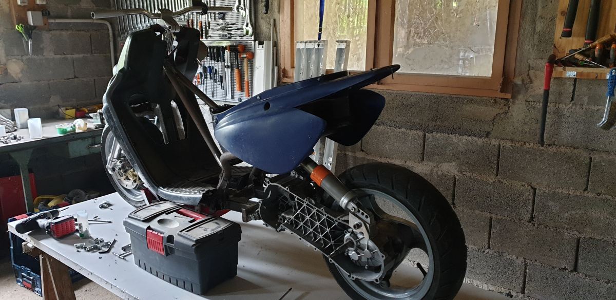 Tefa Posté(e) le 6 mai 2020 Signaler Posté(e) le 6 mai 2020 (modifié) Salut à tous, je partage ces quelques lignes pour vous présenter mon projet. Un rocket avec un BM de NRG que j'ai depuis environ 10 ans en carton au fond de l'atelier. Vu le confinement, je me décide de lui redonner vie... Pour l'instant, montage à blanc, je regroupe toutes les pièces et j'adapte J'ai dessus un 70 MK Pro race 2 avec son échappement, vilebrequin Stage6 BAC V-Force Stage6, pipe Malossi et PWK de 28 Stage6 également. Pour l'instant côté transmission juste un embrayage S6 toujours. Le cadre est terminé, le train avant aussi et les carénages quasiment fini aussi (quelques retouches à faire encore). Demain opération polissage BM + fourche N'hésitez pas a me laisser vos commentaires, je posterais des photos à fur et à mesure... PS : j'ai pas précisé, je suis usineur, donc si vous avez des questions niveau usinage n'hésitez surtout pas, je serais ravi de pouvoir vous éclairer si je peux! Modifié le 6 mai 2020 par Tefa 2