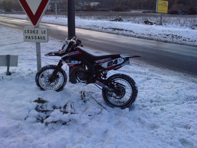 -z- Posté(e) le 2 février 2012 Auteur Signaler Posté(e) le 2 février 2012 (modifié) J'ai du mal a croire qu'avec un anti patate on pouvait avoir plus de perfs :o Je vais voir le prix tiens :D ça coûte 15bitch ça vaut le coup, puis c'est plus joli que l'origine mdr Si tu le pense dans ta tête oui. (vu que ton anti est neuf) Salut, belle moto ! Je pourrais savoir comment tu as fait pour fixer tes clignotants avant avec la YZ ? Parce que je compte mettre la même là je me tâte pour quel halogène prendre en fait pour qu'il éclaire bien, et ou le placer :/.. (Un longue porté sur la tête de fourche j'ai pensée mais çan risque d'éblouir non? Ou il y a un mode "feu de croisement" ? merci :) alors je les ai fixés avec le support en plastique d'origine ça va nickel, et l'halogène provient de dafy moto mais pas de mode feu de croisement. Vaut mieux le placer a droite pour eviter d'éblouir ceux qui arrivent en face.. sinon tu la met dans le garde boue ça fait plus discret bon mauvaise nouvelle pour les durites de refroidissement, le diamètre intérieur est trop grand donc a peine branché ça a giclé de partout :lol: sa rendait super bien mais obliger de remettre celles d'origines... a moins que j'en trouvent d'autres avec un diamètre approprié! nouvelles photos dans la neige, attention il y a au moins 10cm la (h) Modifié le 2 février 2012 par -z-