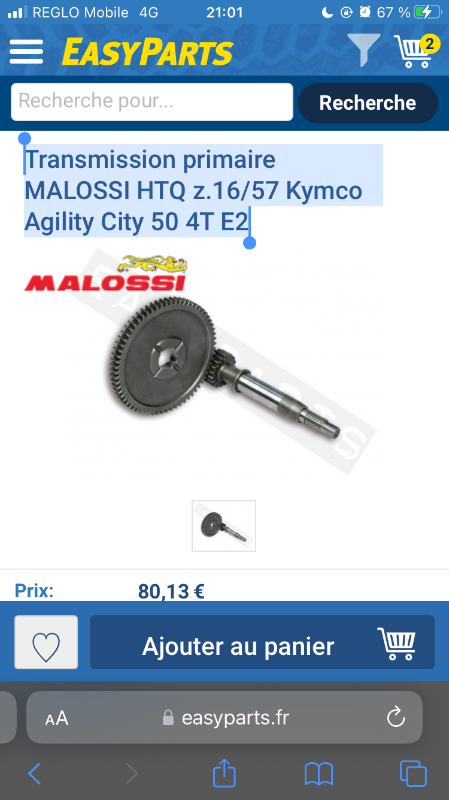 Alain Posté(e) le 24 septembre 2022 Auteur Signaler Posté(e) le 24 septembre 2022 (modifié) Ingranaggi: INGRANAGGI PRIMARI MALOSSI HTQ z 16 57 PER KYMCO AGILITY PEOPLE 6714189 (ricambimoto2000.it) Il n'existe que la malossi pour ce moteur. Modifié le 24 septembre 2022 par Alain