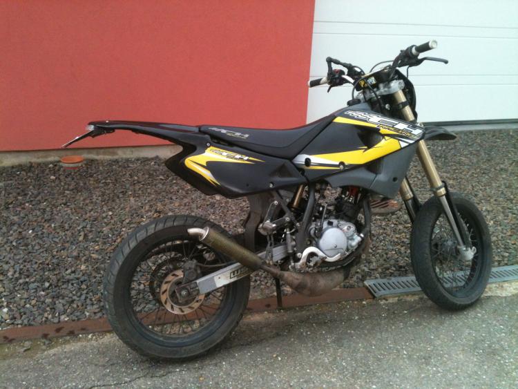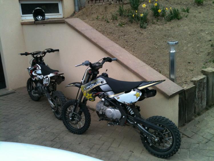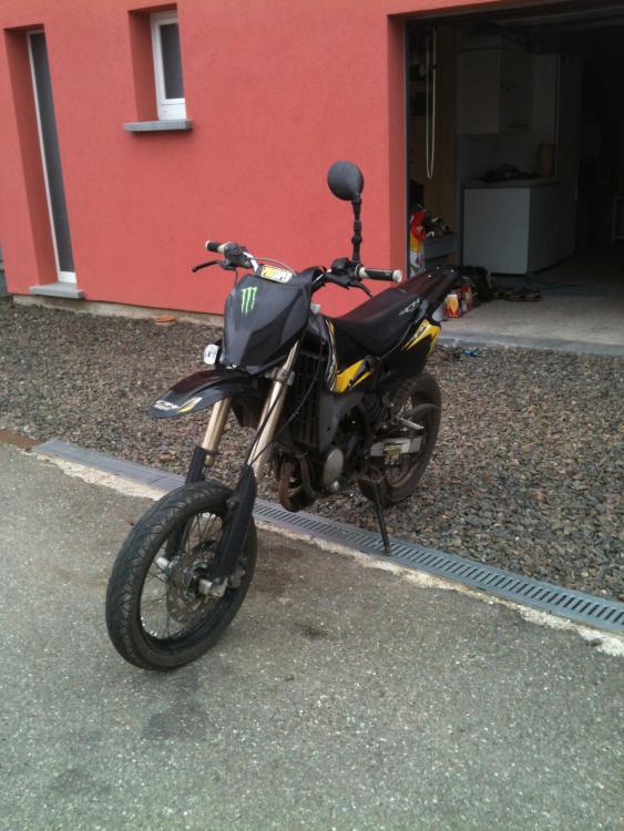 flotiibus67 Posté(e) le 31 mai 2012 Signaler Posté(e) le 31 mai 2012 bonjour a tous, depuis le temps je me suis décidé a présenter ma petite mécaboîte :) partie moteur : -kit 75cc top rose due plus ( repeint en noir ) -carburateur dellorti 21 -pipe mvt 21 -allumage mvt rotor interne avec lumiere -vilebrequin renforcé conti chr -BAC artek -yasuni r3 cartouche kévlar partie esthétique : - guidon conti -mousse de puidon protaper -poignée progrip noir/blanc -feu arrière a led ( bavette enduro ) -sélécteur de vitesse chromé -plaque phare yz -hallogene de coté -kit chaîne affam rétroviseur enlever :siffle: -chassis de 125 -fourche 125 gros diametre préparation moteur : - haut moteur surélever pour ouverture complète des transfere -piston préparer -prépa bas moteur ( admission des gaz, allignement haut moteur) -BAC préparer je compte encore mettre un kit deco et quelques bricoles mais j'ai éfféctuer la plus pars des projet que j'avais en tete :) ps : ma dirt 140cc apollo et la pister pro de mon frere en bonus :love: