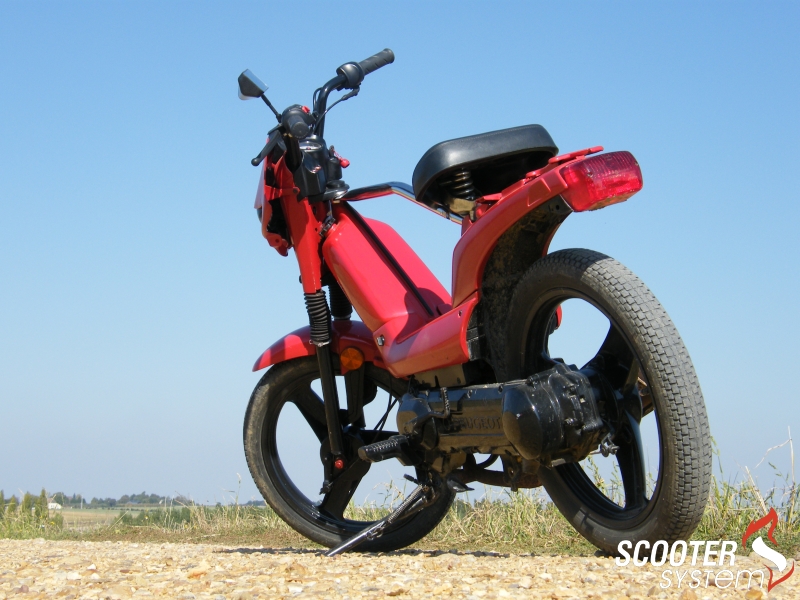 Une ancienne la poste reconvertie avec pot ninja g1,vario malossi multiver et ressort de poussé malossi jaune,ce qui fait du 75 km/h